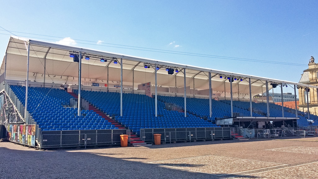 Der Schlossplatz steht zudem nur für begrenzte Zeiträume zur Verfügung: „In den Ministerien wird bis rund 16 Uhr gearbeitet, deswegen dürfen wir immer erst ab 15:30 Uhr mit dem Soundcheck beginnen. Das Finanzministerium hat noch einen Hintereingang, das Wirtschaftsministerium allerdings nur einen Eingang auf unserer Baustelle. Den Mitarbeitern haben wir einen Zugang aus Zäunen gebaut, sodass sie während des Aufbaus sicher am Haus entlang können, ohne in den Staplerverkehr reinlaufen zu müssen. Allerdings entsteht später das Problem, dass wir in dem Bereich unsere Follow-Tower aufbauen müssen. Dann wird der Weg wieder aufgelöst, und wir bauen einen Zugang, der die Mitarbeiter davor entlangführt.“ Die Planung und Abstimmung habe viel Aufwand erfordert. Im mittleren Schlossflügel steht zudem eine große Garderobe zur Verfügung: „Die bekommt der Stargast des Abends.“