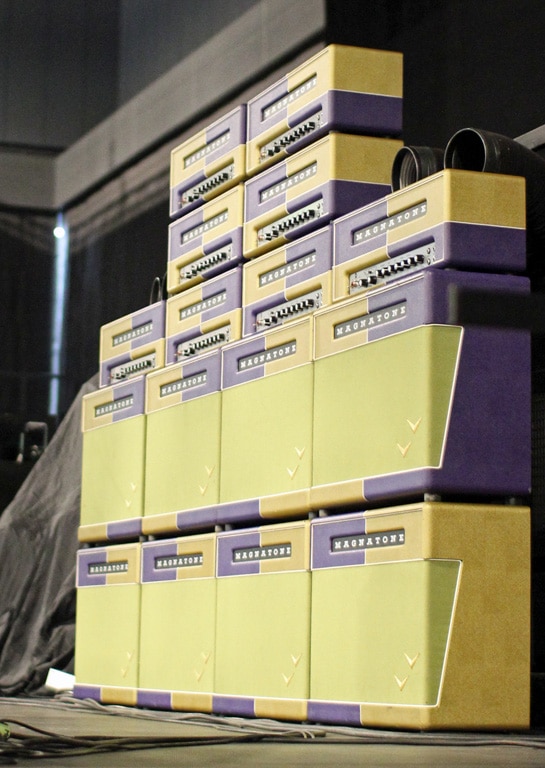 Erweitertes „Bühnen-Monitoring“Links und rechts der Bühne steht je ein großes Magnatone-Amp-Stack, das weitgehend optischen Gründen dient. Lediglich zwei äußere 2 x 12-Zoll-Boxen werden mit Bass- und Gitarrensignalen gefüttert, zum Monitoring für Billy Gibbons, der auf In-Ear-Einsatz verzichtet (Bild: Nicolay Ketterer)