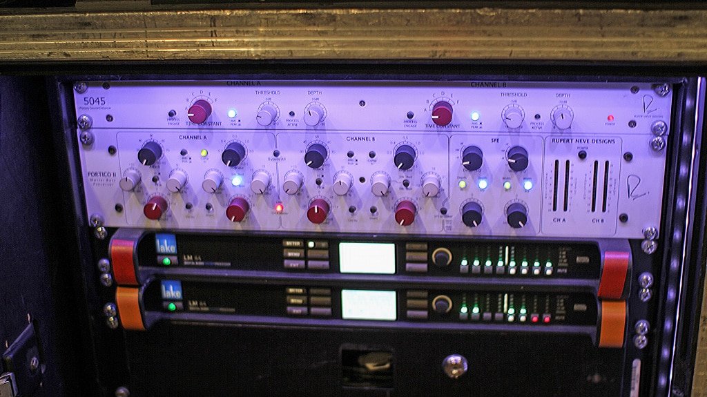 Ob das nicht der eigentliche „Traum“ eines FoHs sei, den Sound frei gestalten zu können, ohne auf den Ausgleich des Bühnenschalls Rücksicht nehmen zu müssen? „Technisch gesehen mag das stimmen, außer dass Billy ungefähr so laut singt: (spricht in gehaucht-rauem Flüsterton). Das Telefunken M80 ist das einzige Mikrofon, mit dem wir ausreichend Gain-before Feedback-Pegel erreichen, rund 6 dB mehr Gain als mit anderen Modellen. Das funktioniert mit seiner Supernieren-Charakteristik sehr gut für Billy und hilft entscheidend an Tagen, wenn er weniger kräftig ‚singt‘. Der Portico 5045 hilft mir ebenfalls, etwas mehr Pegel zu erreichen. Das wird schwieriger, wenn die Band sich dahinter richtig ‚reinlegt‘ und ich den Gesang immer noch gerade so darübersetzen möchte. Je nach Song ‚reite‘ ich den Fader am Pult permanent und ziehe das Mikrofon in Pausen herunter. Allerdings muss ich aufpassen: Aufgrund der hohen Verstärkung bekomme ich Ambience-Übersprechen vom Schlagzeug und nutze es praktisch im Verbund mit den Overheads. Dusty hingegen singt laut, bei seinem Gesangsmikrofon habe ich keine Probleme durch Übersprechen.“ Die Gitarren- und Bassklänge bearbeite er kaum, erklärt Rephann. „Die Sounds, die aus Billys Boxen kommen – das ist der ZZ-Top-Sound, den Billy hören möchte. Ich habe eine Palmer-DI-Box mit einem cleanen Sound am Pult anliegen, dazu zwei Magnatone-Amp-Signale und ein Marshall-Stack, die blende ich zusammen. Für die Einzelsignale lege ich jeweils ein Stereo-Signal an, sodass ich sie etwas doppeln kann. Bislang hatte ich keine Probleme mit Phasing, wenn ich die Kanäle dopple und die verschiedenen Amp-Signale zusammenmische.“