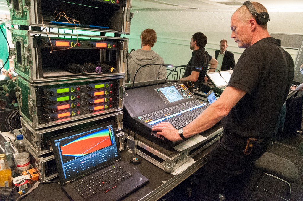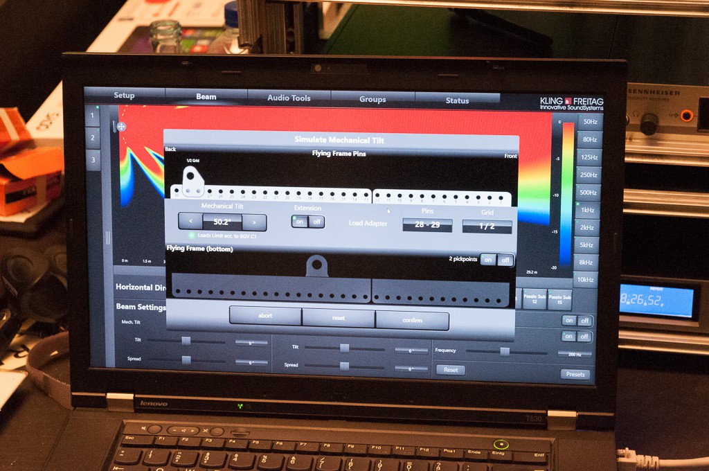 Zurück zur Klimakonferenz gab es eine etwas andere Situation. Es galt, die bis auf 4 m Höhe ansteigende Tribüne von 25 Meter Tiefe zu beschallen. Dazu wurden gemeinsam mit Arne Muscheites zwei übereinander geflogene Kling & Freitag VIDA eingeplant, auf deren Rückseite jeweils das VIDA-Cardioid-Modul montiert war. Ingmar Vater zur Wirkung dieser Zusatz-Module: „Mit Cardioid fällt nach hinten kaum Mulm in den Low-Mids an. Im Gegenteil: Die Abstrahlung nach hinten klingt so ausgeglichen, dass sich auch Redner hinter den Lautsprechern ohne zusätzliches Monitoring wohlfühlen können.“ Hier sammelte das Team Erfahrungen damit, den Nah- und Fernbereich der Tribüne mit Hilfe des Beam-Steerings möglichst gleichmäßig zu beschallen. Ingmar Vater erklärt dazu zwei unterschiedliche Ansätze: „Man konnte beide VIDA-Module unseres Arrays als unabhängige Schallquellen benutzen und einen Lautsprecher für den vorderen Bereich, den anderen für den hinteren Bereich elektronisch ausrichten. Oder man definiert das Array quasi als einen einzigen Lautsprecher und kann damit auch den Split-Beam verwenden. Welche Lösung für den Anwendungsfall optimal ist, kann man durch die Realtime-Fernsteuerung ganz unkompliziert ausprobieren. Sowohl Ausrichtung und Spreizung des Beams, Konfiguration des Lautsprecher-Arrays, EQ-Einstellungen und vieles mehr können übersichtlich in der VIDA-App vorgenommen werden.“ Später wird das Team hier sicherlich auf die gesammelten Erfahrungen zurückgreifen können – vor allem, wenn es schnell gehen muss. Angenehmer Effekt bei diesem Setup: Für die ME36 wurde keinerlei EQ am Mischpult benötigt, was sicher nicht selbstverständlich ist.