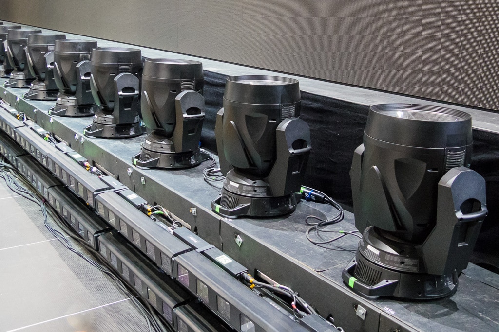 Der „Fahnenmast“, der als Laufsteg in den Publikumsraum führte, war mit Martin Sceptrons gesäumt. Neben der LED-Wand sorgten die neuen Vari-Lite VL 6000 im Verbund mit Philips Nitro Strobes für enormen Druck und prächtige Looks. Überdies waren an den Traversen weitere VL 6000 positioniert. Die Produktion gehört zu den ersten, die die VL 6000 einsetzen konnte.