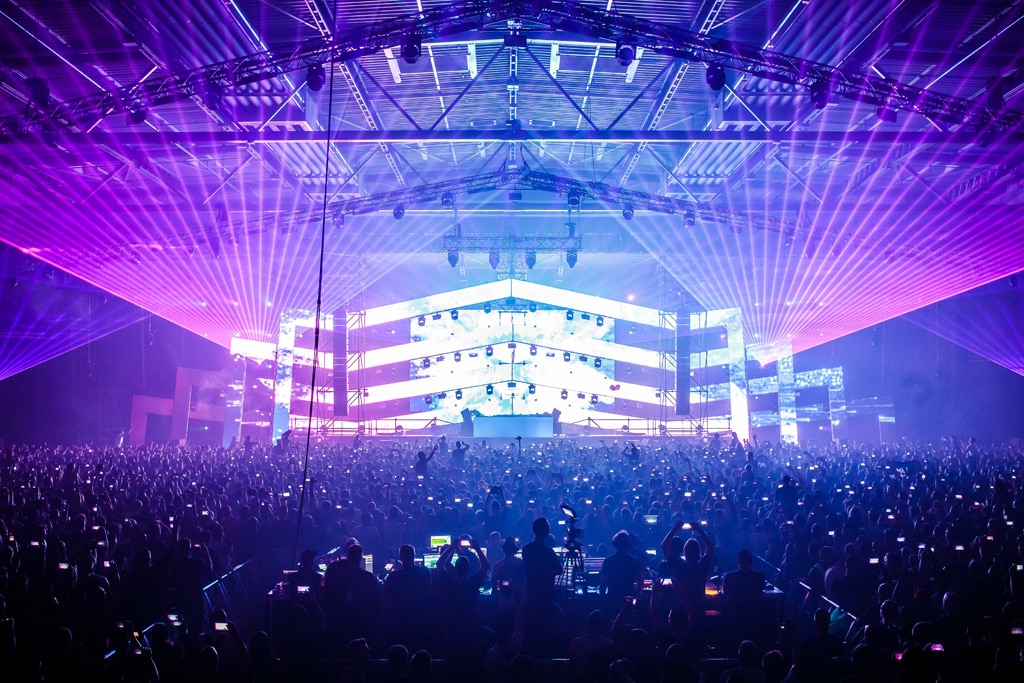 Um die unterschiedlichen Gewohnheiten der DJs abzudecken, bot die Produktion sowohl Pioneer- als auch DenonDJ-Decks an. Die jeweilige Marke konnte ins Zentrum der Booth geschoben werden, der DJ war so in der Lage dort sein Notebook einzustöpseln. „Wir wollten die DJ-Booth so kompakt wie möglich halten, aber gleichzeitig das Setup sowohl mit Pioneer- und Denon-Geräten unterbringen. Daher hatten wir uns zunächst überlegt, die Booth asymmetrisch auf der Bühne zu positionieren. Das sah in Verbindung mit der Bühnenoptik und dem Licht allerdings nicht so gut aus. Daher haben wir kurzfristig ein Slider-System improvisiert: Wir sind zu einer nahegelegenen Bauhaus-Filiale gefahren und haben Baumaterial gekauft. Das System besteht aus einer großen Holzplatte mit vier Griffen. Darauf haben wir Noppenschaumstoff montiert, der als Absorber dient. Das Equipment ist auf dem Noppenschaumstoff befestigt. Wenn ein Künstler das Pioneer-Equipment nutzt, befindet sich der DJ Mixer in der Mitte der Booth. Möchte ein DJ auf das Denon-Setup umsteigen, verschiebt er die Platte, sodass der Denon-Mixer im Zentrum steht.“ Sein Fazit nach der Show? „Wir müssen nichts am diesjährigen Konzept verändern“ Santegoeds arbeitete am Show-Tag als Produktionsleiter bis 21 Uhr, dann übernahm sein Kollege die Nachtschicht. „Ich habe mir die Show angesehen, bis Brennan Heart mit seinem Set anfing“, erzählt er im Nachgang. „Bis zu dem Zeitpunkt hatten wir noch nicht alle Licht-Fixtures verwendet, aber mein persönlicher Favorit waren die Conan LED-Par-Scheinwerfer sowie die Blinder am Boden. Beide vermittelten den Eindruck von Tiefe im Set, und beleuchteten die Rückseite der LED-Panele. Dadurch konnten die Zuschauer die Winkel und Form der LEDs sehr gut sehen, ohne Inhalte auf den Panels zu zeigen.“ Im Nachgang erzählt er auch, dass das Konzept genau wie geplant umgesetzt werden konnte. „Wir hatten 3 cm ‚Luft‘ zwischen den Pre-Riggs und dem Dach. Mittlerweile haben wir entschieden, nichts am diesjährigen Konzept zu verändern. Das Setup wird – in kleinerem Maßstab – in Wien und den anderen Städten, die wir besuchen, ebenso stattfinden.“