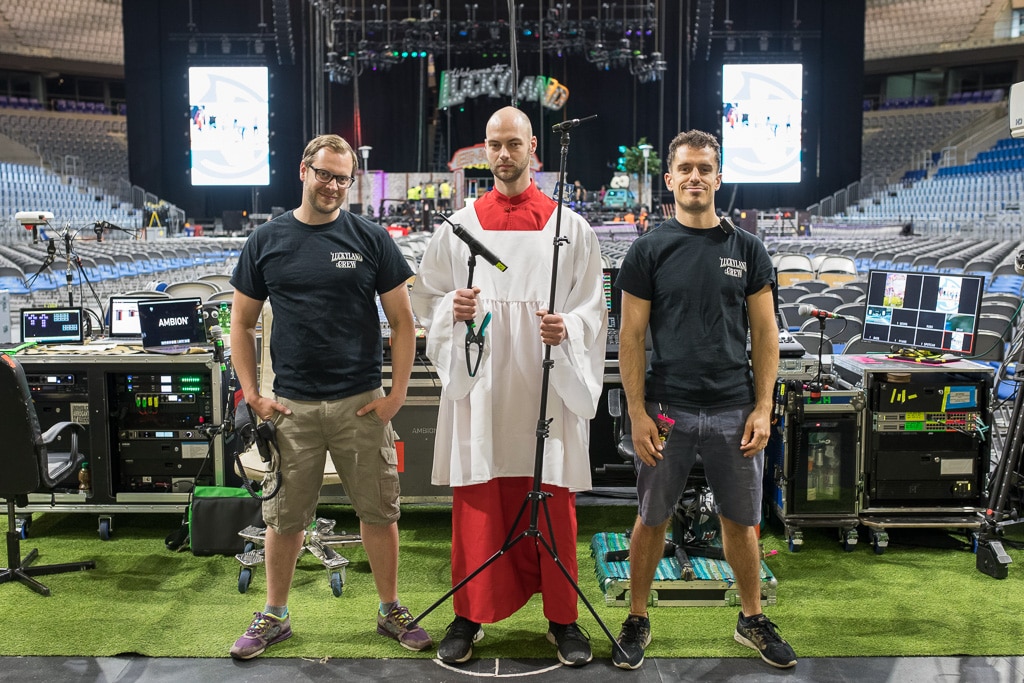 Angesteuert wird vom Yamaha CL5 über fünf Lake-Controller, wovon sich zwei am FoH-Platz und drei an der Bühne befinden. Die Signalverteilung findet komplett über AES und Dante statt. „Nach der A/D-Wandlung der Input-Signale bleibt die Signalverarbeitung bis zur D/A-Wandlung im Amp komplett digital, was eine sehr gute Auflösung des gesamten Systems zur Folge hat“, betonte Stephen Stiegler. Während der Tournee wurden die Airay-Elemente der Side-PA auf einen Abstrahlwinkel von 120 Grad umgebaut. Diese Arbeit, die durch Ambion kurz nach Tourstart vorgenommen wurde, war nötig, da in vielen Spielorten die Plätze auf über 180 Grad verkauft wurden und somit teilweise hinter der Bühnenkante lagen. Die beiden erfahrenen Freelancer lobten ausdrücklich den engagierten und kompetenten Ambion-Service.
