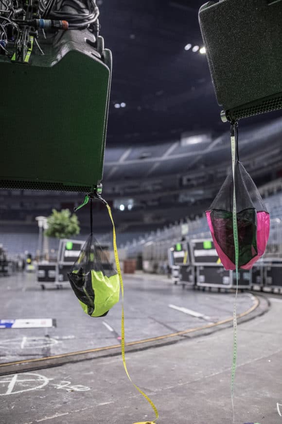 Auch für die Höhenkontrolle der Line-Arrays hat sich die Toncrew eine witzig-praktische Idee einfallen lassen: Damit die Magnete am Ende des Maßbands nach dem „Abreißen“nicht mehr mit einem lauten Klack auf den Hallenboden prallen (und eventuell beschädigt werden), werden sie mit kleinen Fallschirmen versehen und schweben so zurück in die Hände der Techniker.