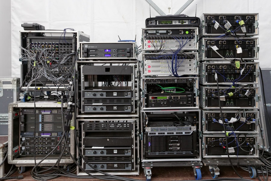 Die Amps stammten größtenteils aus dem Portfolio von HK Audio: drei VX 2400 für CDR 108 C unter der Bühne, zwei HK Audio/Lab.gruppen IPD 2400 (für L5 LTS mittig oberhalb der Bühne) und vier Lab.gruppen FP 10000Q, kontrolliert von zwei FirNet Linear Phase Controllern für Line-Arrays und Subwoofer. Die um den Zuschauerbereich herum platzierten Lautsprecher wurden von sechs t.amp TSA 4-700 angetrieben