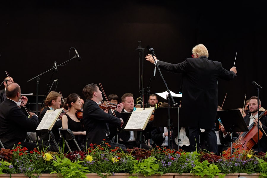 Ein sommerliches Abendkonzert unter dem Sonnendach des Schlossgartens auf der Bodensee-Insel Mainau: Zum wiederholten Mal gastierte der international erfolgreiche Dirigent Justus Frantz im Juli 2016 auf der Insel Mainau. Mit der Philharmonie der Nationen wurden Werke von Max Bruch, Antonín Dvorak und Johann Strauß gespielt, und das Dach schützte nicht nur gegen UV-Strahlen, sondern zu vorgerückter Stunde neben den Musikern auch mehr als 1.100 Gäste gegen einen veritablen Wolkenbruch.