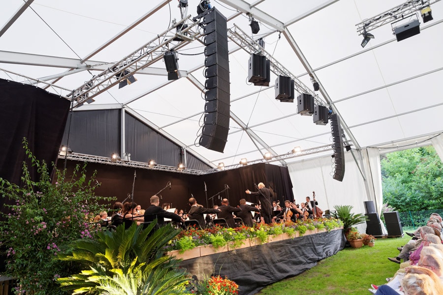 „Trotz des Zeltdachs haben wir auf dem Rasenplatz keine nennenswerten Nachhallzeiten“, erklärte EVENTED-Eigentümer Michael Woll. „Dabei nehmen die Gäste das Zelt durchaus als Raum war, weshalb ihr optischer Eindruck früher gelegentlich nicht mit den akustischen Gegebenheiten korrespondierte. In den vergangenen Jahren meldeten sich mitunter Zuhörer, denen es „zu leise“ war, was nach meinem Dafürhalten nicht am Pegel der Main-PA, sondern an fehlenden Reflexionen lag.“ Um das Problem zu adressieren, wurde auf der Insel Mainau 2016 erstmals mit SpatialSound Wave des Fraunhofer-Instituts für Digitale Medientechnologie IDMT gearbeitet – Details zu diesem objektbasierten Produktions- und Wiedergabeverfahren finden sich hier in unserem Artikel “Richtungsbasierte Audiowiedergabe im Opernhaus Zürich“.