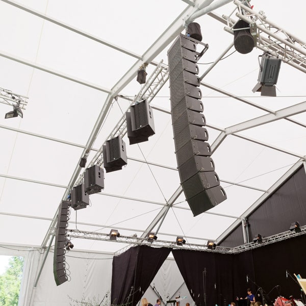 Entlang des Zeltgiebels führte eine Traverse, an welcher fünf nach unten abstrahlende HK Audio VT 115 X L/R befestigt waren, die das Publikum umgebenden, an Zeltmasten montierten Lautsprecher waren HK Audio CT 108 (Bild: Jörg Küster)