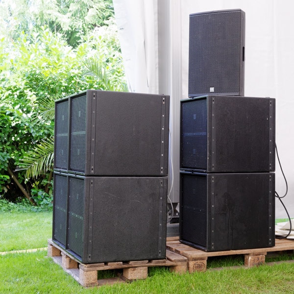 Für die Wiedergabe tiefer Frequenzen sorgten pro Seite sechs HK Audio Cohedra Compact CDR 210 C. Die Bässe wurden in Cardioid-Anordnung betrieben: Hinter dem vorderen Viererpaket standen zwei weiteren Einheiten, die phasengedreht angesteuert wurden und auf diese Weise zu Signalauslöschungen führten. Die Wahl geeigneter Delay-Zeiten resultierte in einer supernierenförmigen Richtcharakteristik, bei welcher die Auslöschung in Richtung der Bühne am stärksten ausgeprägt war. Die Zeiten wurden in den FirNet Controller eingegeben, nachdem sie zuvor mit einer App („DDT Cardioid“ von Danley Sound Labs) auf einem iPhone simuliert worden waren. Auf den Subwoofern war pro Seite eine HK Audio CT 115 positioniert, um die Bühne noch breiter zu machen und den Übergang zu den das Publikum um – gebenden HK Audio CT 108 zu verbessern.