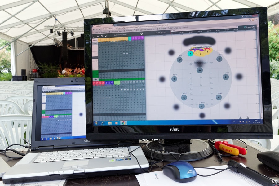 Quellen bzw. Schallobjekte lassen sich bei SpatialSound Wave dreidimensional positionieren, und Oliver Thiel hatte die Wiedergabe mithilfe der Browser-basierten Bedien-Software („Spatial Production App“) in etwa zwei bis drei Meter Höhe angeordnet, was bei einem Meter Bühnenhöhe nur marginal über der realen Instrumentenpositionen war. Die Raumsimulation hatte er etwas oberhalb der äußeren Lautsprecher positioniert. Als Modell für SpatialSound Wave hatte der Systemtechniker eine Kuppel mit einem Radius von 30 Meter gewählt, welcher er im Vergleich zum ebenfalls im Angebot befindlichen Pyramidenmodell ein gleichmäßigeres Übergangsverhalten auf der Z-Achse bescheinigte.