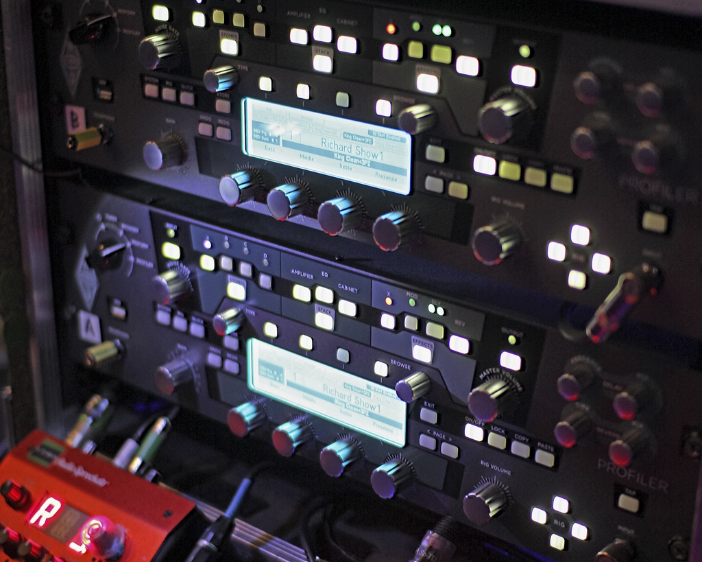 Kemper-Rigs Alle Gitarren-Amps sind aus dem Setup verschwunden – stattdessen setzt die Produktion auf „stille“ Kemper-Rigs, wie hier bei Richard Bennett. Beide Exemplare laufen parallel, am Mischpult wird im Problemfall das Signal umgeschaltet (Bild: Nicolay Ketterer)