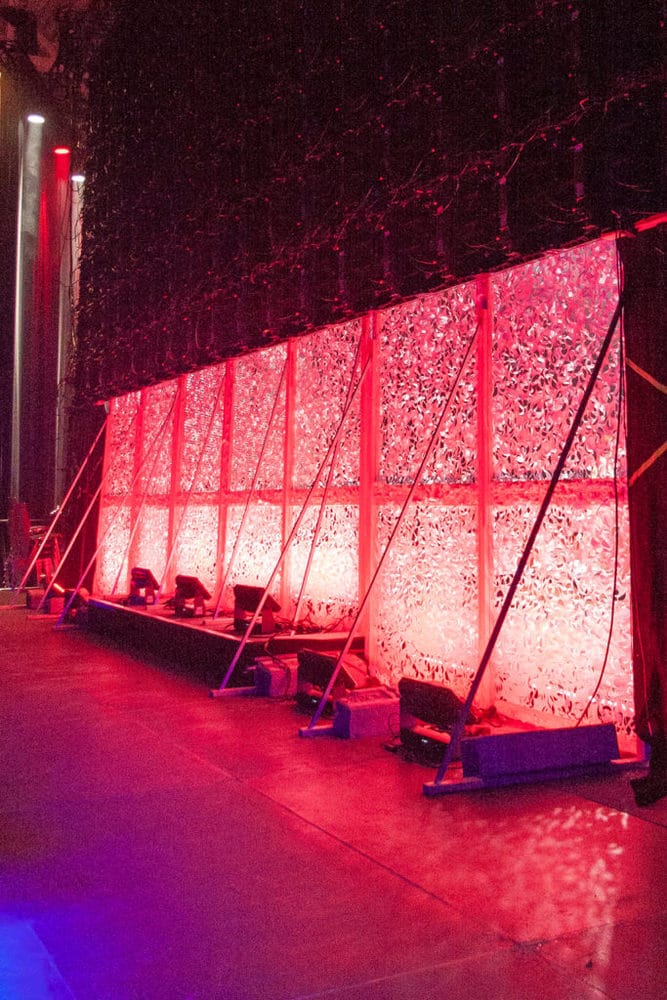 Dekoration der Bühnenrückwand: der untere Teil der Bühnenrückwand war mit fahrbaren „Bühnenlaub-Risern“ verkleidet (Bild: Stefan Junker)