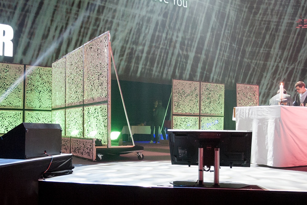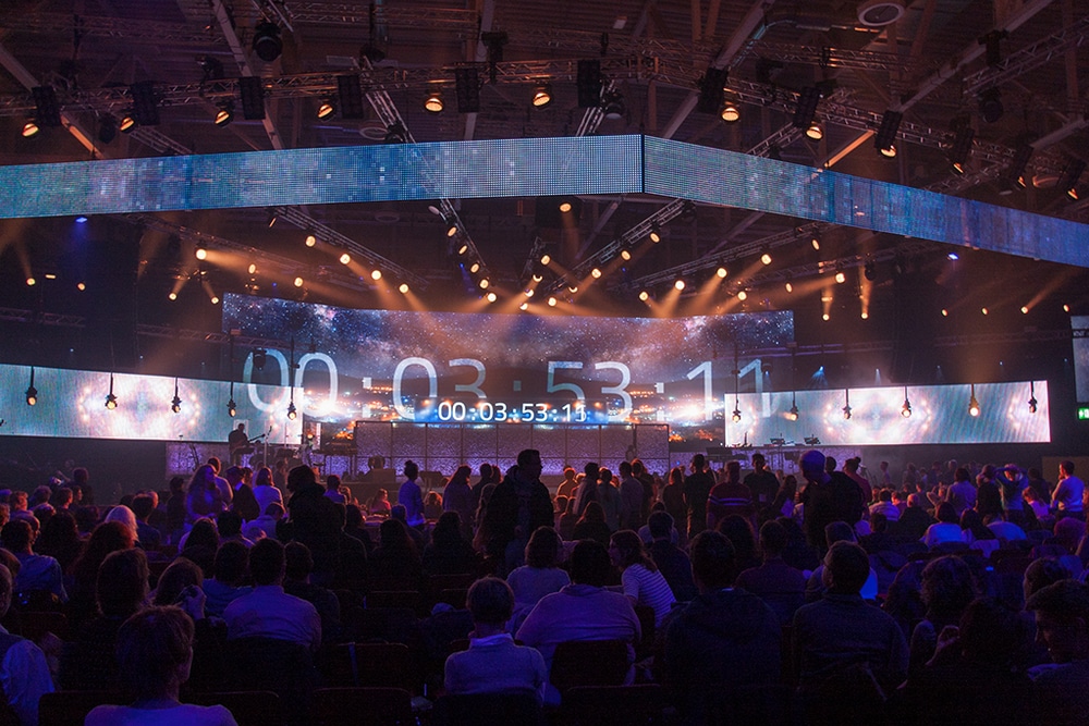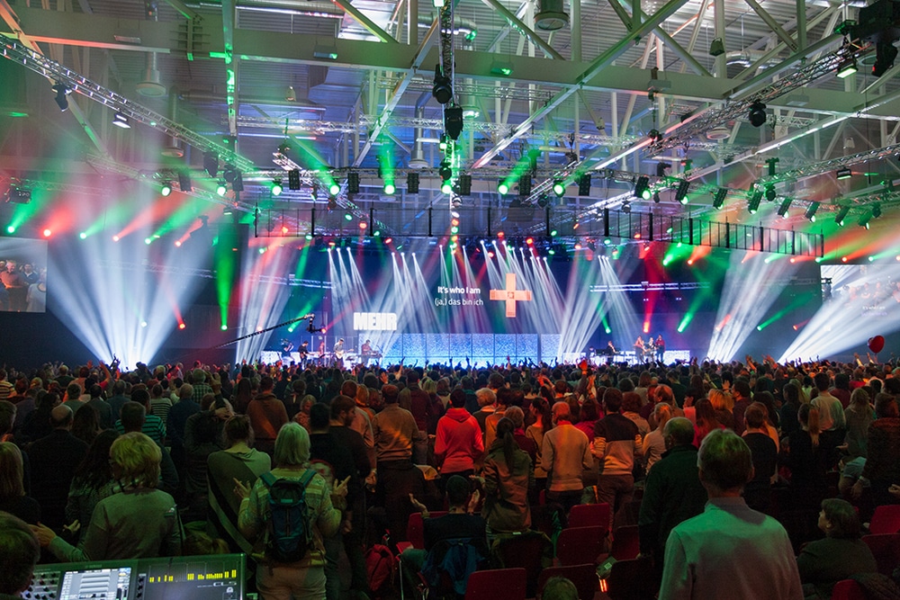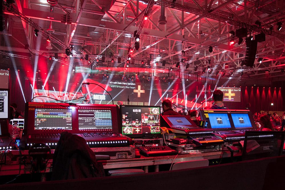 Über 500 Scheinwerfer, mehr als 170m² LED-Wand und ordentlich Beschallungsmaterial von L-Acoustics lesen sich wie die Fakten einer amerikanischen Musikproduktion – sind aber die Eckdaten einer kirchlichen Veranstaltung. Auf eine Trennung zwischen Bühne und Publikumslicht wurde verzichtet – im Zusammenspiel mit den Kameras erforderte dies ein hohes Maß an Fingerspitzengefühl, um Publikum und Bildtechnik gleichermaßen zufrieden zu stellen.
