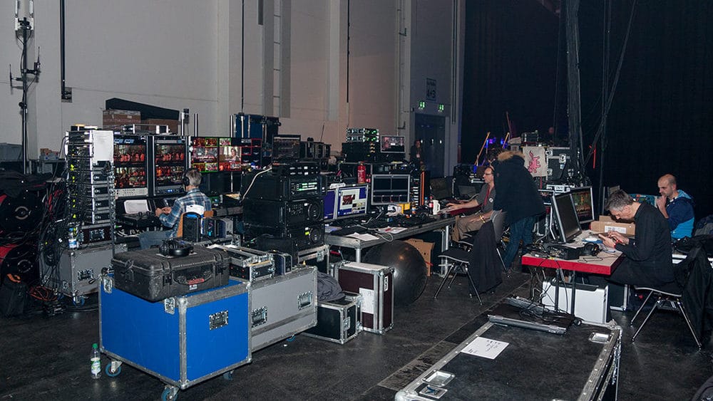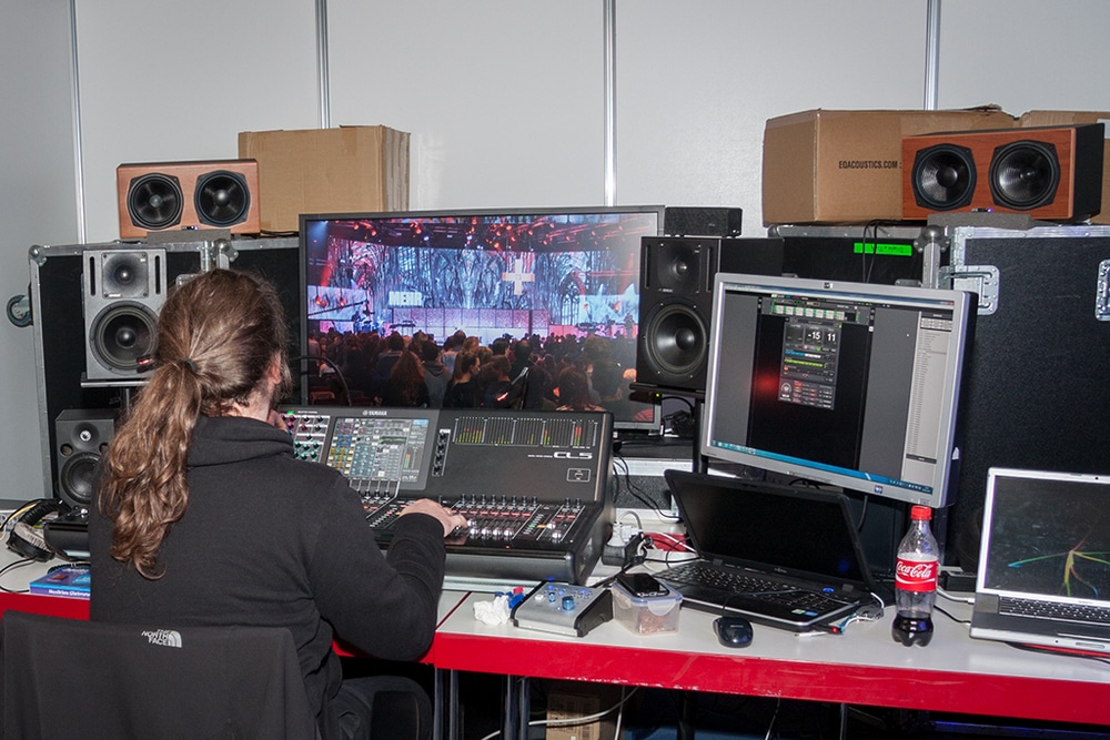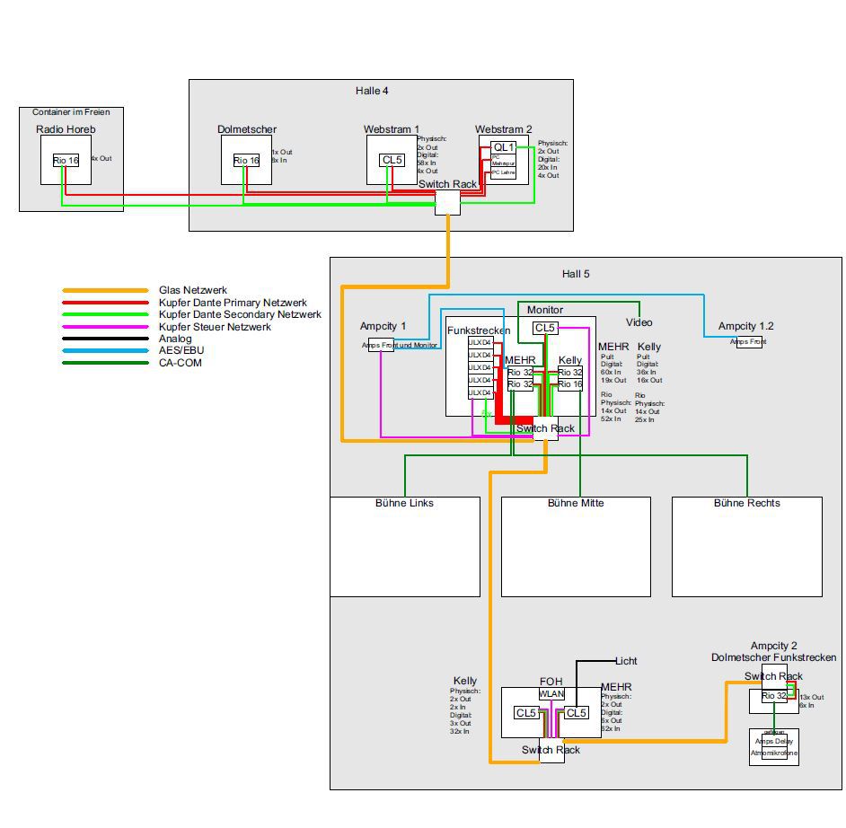 Interessant war vor allem das Dante-Audionetzwerk, welches sich auf verschlungenen Pfaden durch diverse Hallen und zurück bewegte. Neben den klassischen Stationen FOH/Monitor/Amp-City wurde das Signal noch an etlichen weiteren Stellen abgegriffen, beispielsweise für den Ü-Wagen von Radio Horeb, die CD-Produktion, denWebstreamund die Dolmetscher in der benachbarten Halle 4, die die Veranstaltung in bis zu acht verschiedene Sprachen übersetzten. Natürlich flossen diesemultilingualen Übersetzungen nun auch wieder in die Veranstaltungshalle zurück, wo sie über diverse Funkstrecken den internationalen Gästen zur Verfügung gestellt wurden. Weiterhin wurde die englische Übersetzung parallel dazu auch für den Webstream benötigt, der in zwei Versionen auf deutsch und eben englisch ins Netz eingespeist wurde.
