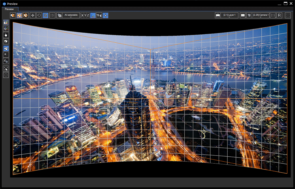 Der interne Warper bietet die Möglichkeit, beliebig viele 3D Editable Meshes zu importieren und anzulegen, die jeweils aus mindestens einer Objektebene und beliebig vielen Subebenen bestehen können. Das Prinzip ist entsprechend auch auf den 2D-Bereich anwendbar, wenn z. B. Content- Teilflächen auf unterschiedliche, unzusammenhängende LEDWände usw. verteilt werden sollen. Auch hier können alle Befehle ohne Umwege im Vorschaufenster in Echtzeit erfolgen. Alle im Preview-Fenster angelegen Objekte (bzw. Flächen) können auf jeden beliebigen Layer verknüpft oder direkt auf den Output gelegt werden. Sämtliche Arbeitsschritte können bequem per Drag & Drop ausgeführt werden – also ohne langwierige Schritte in den Menübäumen der Software. Der benötigte Content wird so zunächst den Layern bzw. dem Output zugewiesen. Anschließend finden sich im Mesh Editing Mode sämtliche Möglichkeiten (FFD usw.), die vorher im externen Warper vorhanden waren.