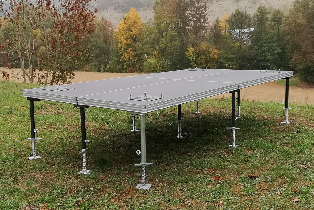 Eine Zeitersparnis ist auch beim Podestaufbau selbst möglich. Wenn man z.B. nicht jeden Podestfuß stecken muss, sondern man dort wo die Podestecken zusammenstoßen jeweils einen gemeinsamen Fuß für alle angrenzende Podestecken verwendet, spart man an Aufwand, Material und demnach auch an Zeit. Das bedeutet: bei der Erstellung einer Steckfuß-Podestbühne von 4 × 6m werden statt 48 Steckfüße (12 Podeste à 4 Steckfüße) nur noch 20 Füße montiert. Der zweite wesentliche Vorteil ist, dass sie nicht nur als Steckfüße dienen, sondern auch gleichzeitig zur Verbindung der einzelnen Bühnenelemente. Dadurch entfallen die zeitraubend zu montierenden, zusätzlichen Verbindungsklammern. Um Höhenunterschiede schnell und stufenlos auszugleichen, ist die Spindelverstellung im Gerüstbau gang und gäbe. Naheliegend, daraus ein neues Gerüstsystem für Outdoor-Bühnen zu konzipieren – welches auf der Landesgartenschaut 2018 in Würzburg zum ersten Mal erfolgreich eingesetzt wurde – mit dem Nebeneffekt, dass kein Gerüstteil aus der Bühne herausragt und sich alle Füße auf einer Achse befinden. In Kombination mit der Mott Praktikus Serie ist das neue Justo-Tragesystem einfach und ohne Werkzeug montierbar.