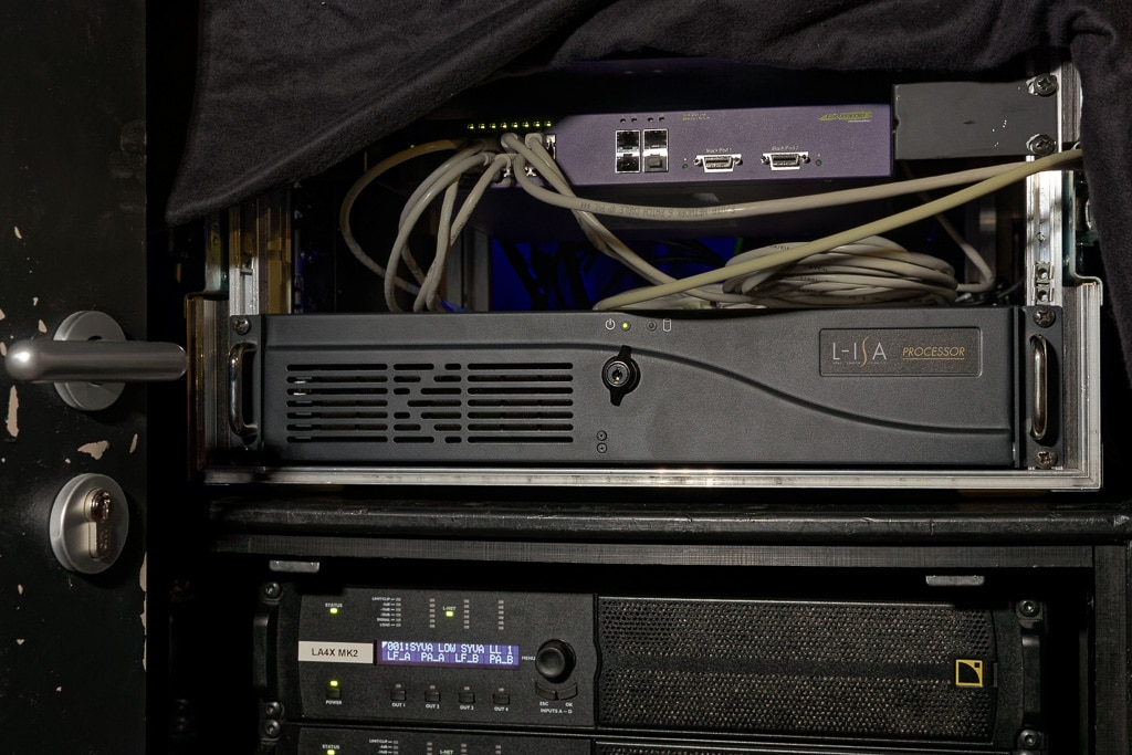 L-ISA Prozessor von L-Acousticsgut versteckt auf dem Podium platziert war dieser Dreh- und Angelpunkt des vielkanaligen Soundsystems. Unten im Bild: Eine vierkanalige LA4X-Endstufe (Bild: Jörg Küster)