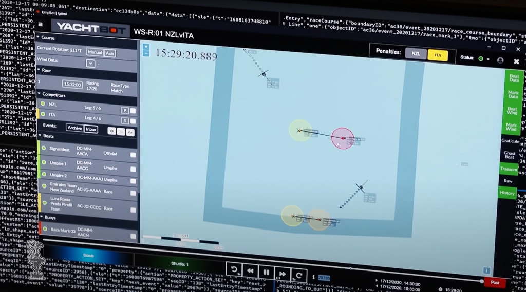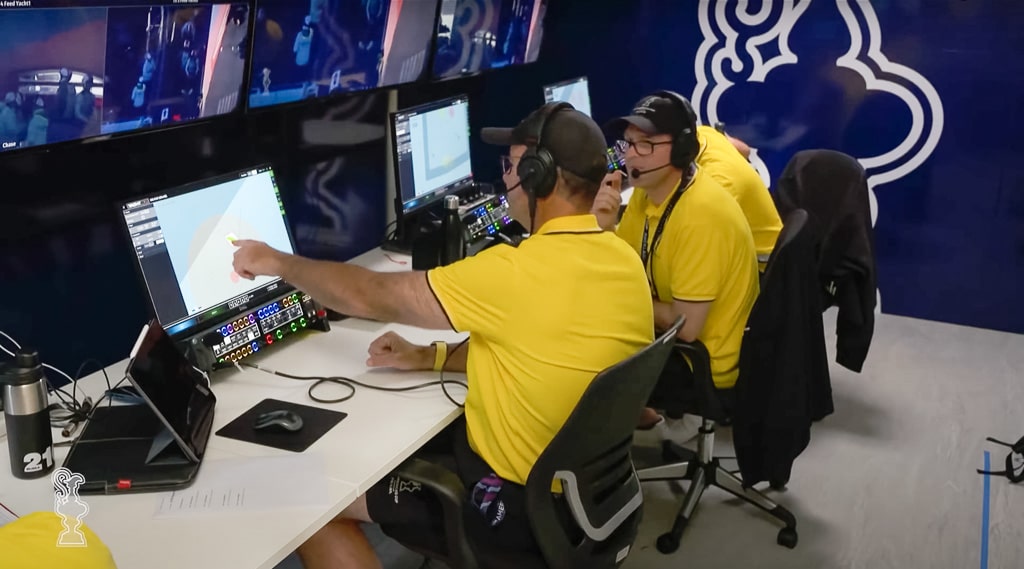Projektleiter Tim Puschkeit betont, dass es nicht mehr die drei getrennten Bereiche Race, Event und Broadcast gibt, und man jetzt nicht auf ein fertig aerodynamisch durchentwickeltes Boot klettert und nochmal Fernsehkameras draufschraubt. „Wir sitzen sehr, sehr tief in der Technik des Bootes. Alle Daten vom Boot laufen zwischen Server oder Switch auf dem Boot durch unser System. Die Daten des Bootes, die sie selbst messen, werden den Teams mit einer Zeitverzögerung von bis zu zehn Sekunden zur Verfügung gestellt, damit die Teams nicht schummeln oder einen Autopiloten generieren können. Wir liefern sie aber in Echtzeit zu den Umpiren, den Schiedsrichtern des Wassers, damit die in Echtzeit mit einer 2-cm-Genauigkeit beurteilen können, ob das Boot zu früh über die Startlinie oder Boundaries gefahren ist.“