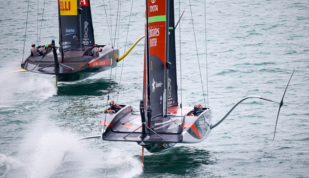 Bei der 36. Auflage hat man dies nochmal drastisch verändert, die AC75 sind nun Monohulls. Sie erheben sich ebenfalls nach Aufnahme von Geschwindigkeit auf Foils aus dem Wasser, um so eher zu „fliegen“ statt zu „schwimmen“. Eine Besonderheit aber ist, dass einer der drei ins Wasser reichenden und mit Ballast versehenen Tragflügel hochgefahren werden kann, sodass die Geschosse auf zwei Tragflächen übers Wasser rasen. Wenn man sich dazu die Youtube-Videos aus der Vorbereitung ansieht, mit welcher Mühe man anfangs überhaupt einen stabilen „Flugzustand“ hergestellt bekam (von kontrollierten Richtungswechseln mal ganz abgesehen), ist nachvollziehbar, dass die einzelnen Teams einige Geheimniskrämerei um ihre Designs machen: Viele Bootsparameter (und eine identische Hebemechanik des foil cant system FCS für die individuell gestalteten Foils) sind vorgegeben, ab dann fängt die Materialforschung der einzelnen Teams an. Thomas Riedel: „Das ist ehrlich gesagt genauso wie Formel 1, auch finanziell in den gleichen Dimensionen. Da werden Spezialisten für Aerodynamik, Elektronik, für alle Bereiche gebraucht. Die Teams kaufen wirklich die besten der Welt.“