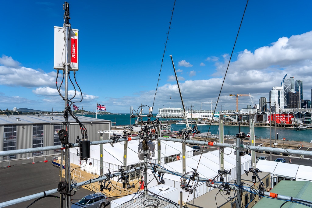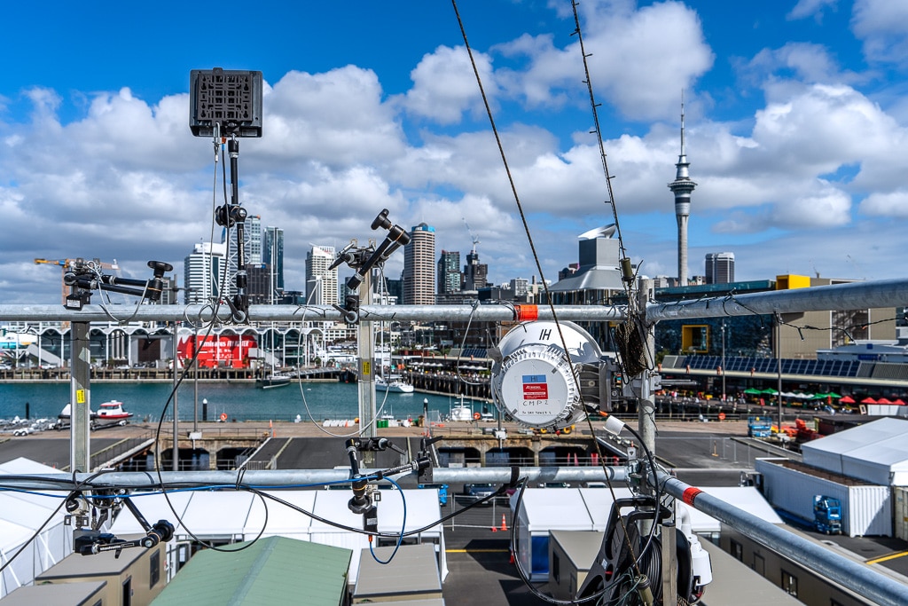Neben den extremen Salzwasserherausforderungen barg auch das Thema HF einige Überraschungen. Tim Puschkeit: „Das hätten wir so auch nicht gedacht. Vor allem in unserem Kerngeschäft drahtloser Übertragung. Auf dem Wasser hat man andere Phänomene bezüglich Reflexionen, Empfang und anderer Boote, die mit eigenem Radar im Weg sind. Hinzu kommt, dass wir eine extremst große Fläche abdecken müssen. Wir haben hier in Auckland fünf Rennboxen, die potentiell befahren werden können. Eine wird am Vorabend benannt, aber erst am nächsten Morgen final bestätigt – und kann dann noch verschoben werden. Die sind um die 3 × 5 km lang und Racebox A ist 20, 25 km entfernt von Racebox E. Alle haben verschiedene Voraussetzungen, je nach Windverhältnissen. Außerdem will man die Rennen so offen wie möglich machen mit Stadium Courses nah am Land, neben Bergkuppen und Hügeln, wo die Leute auf den Hängen sitzen und das Rennen selbst gucken können.“
