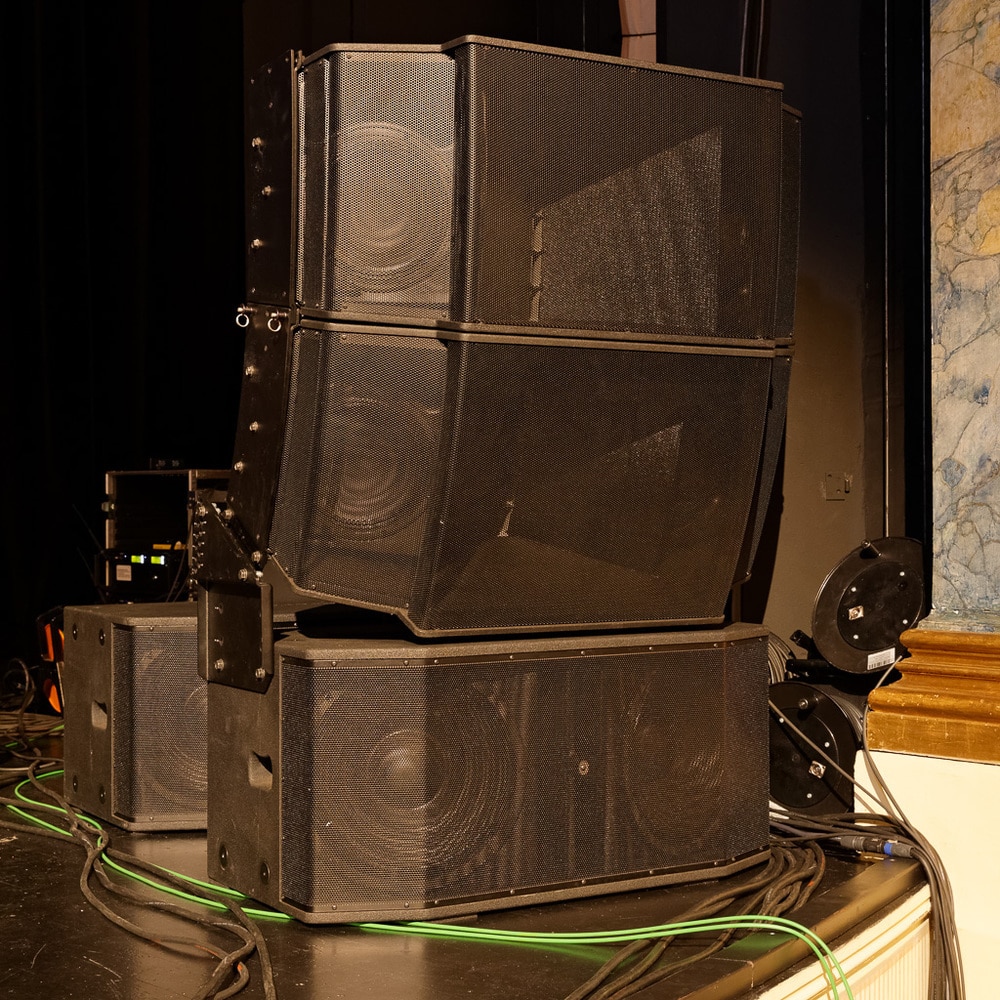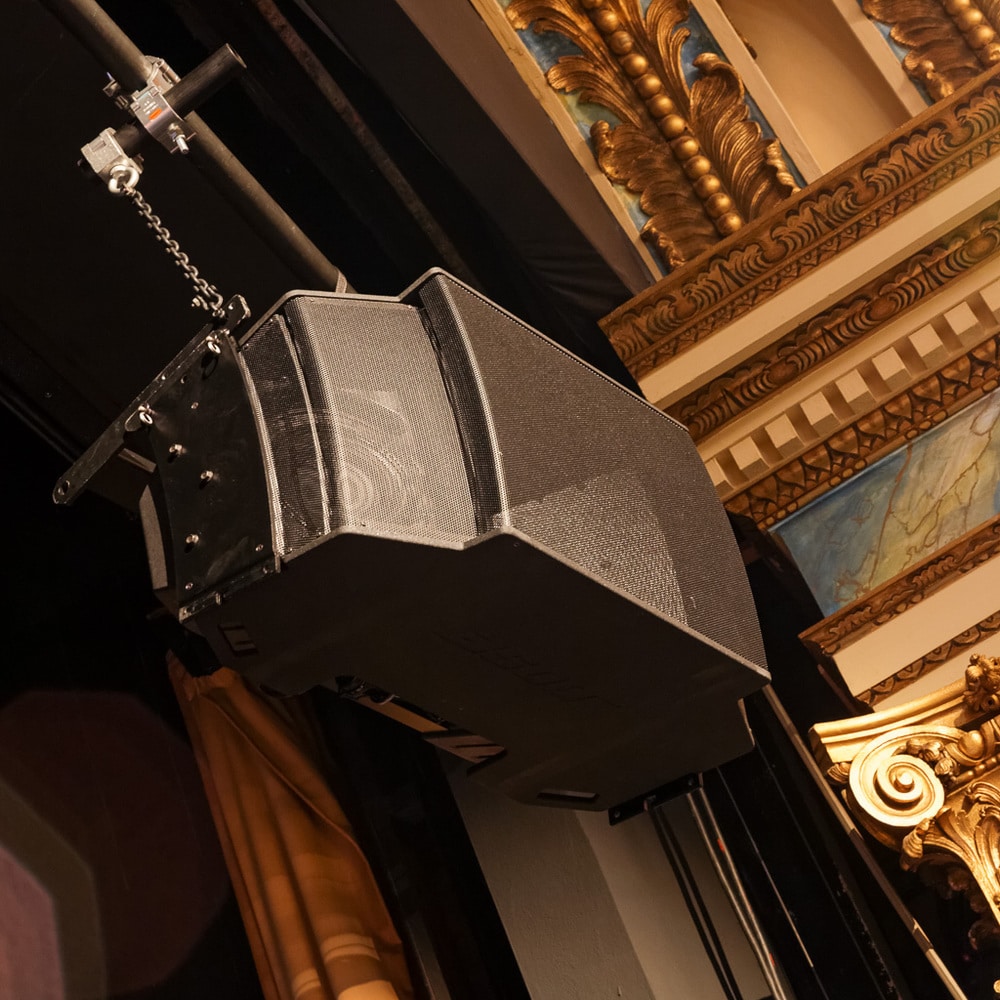 Im zweiten Rang verrichteten links und rechts schlanke Schallzeilen (2 × Bose Panaray MA12EX) mit je zwölf integrierten Fullrange-Chassis ihren Dienst und wurden mit einem nur geringen Pegel betrieben – für hier sitzende Gäste sollte die Ortung auf das Bühnengeschehen gezogen werden. Die Wahl von Zeilenlautsprechern dürfte insofern eine gute Idee gewesen sein, als sich der zweite Rang aufgrund seiner Höhe mehr oder weniger vollständig außerhalb des Direktschallfeldes der Main-PA befand – abzudecken war somit nicht lediglich eine vergleichsweise kurze Strecke, sondern per Linienstrahlereffekt die gesamte Tiefe des Theatersaals.