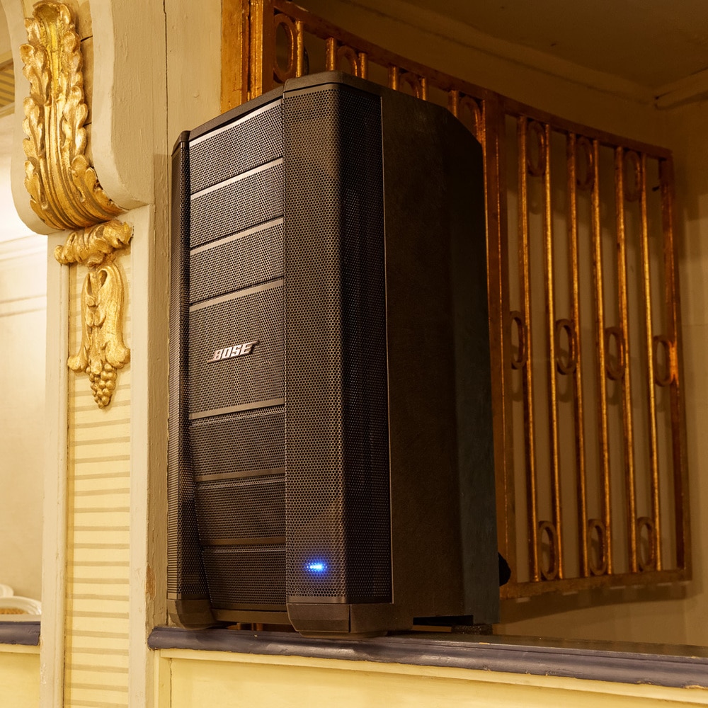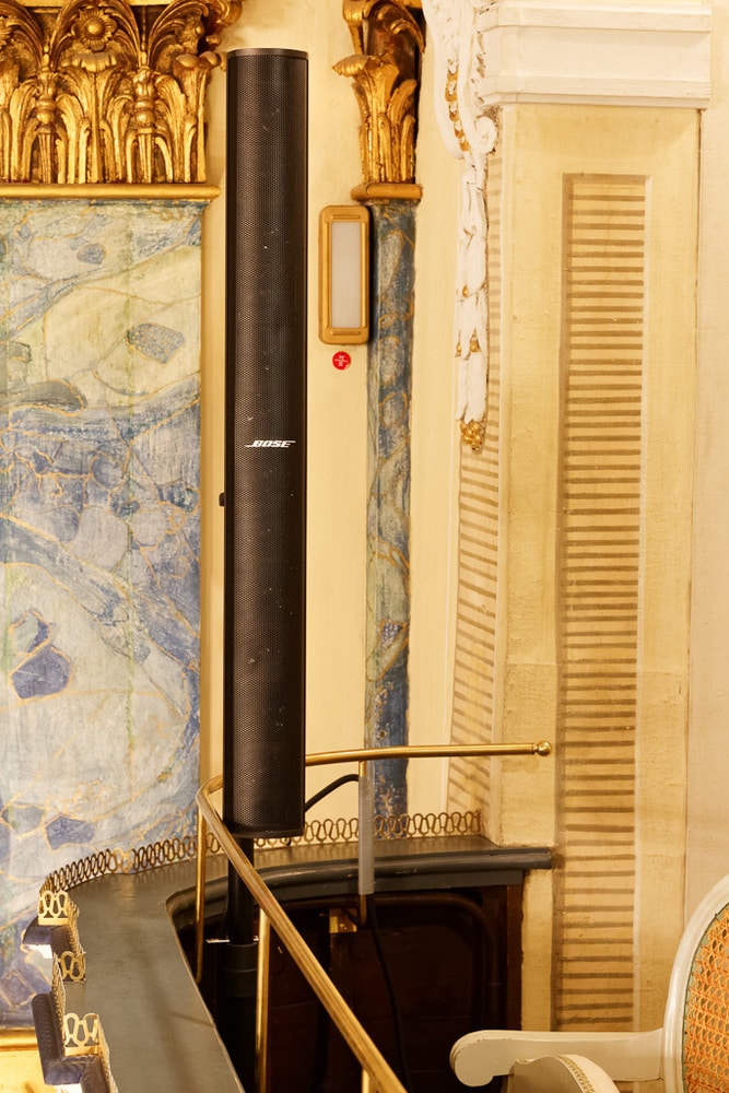 Auf expliziten Wunsch von Naidoo/Herberger kamen im Parkett zwei Surround-Lautsprecher zum Einsatz, die auf Brüstungen seitlich hinter dem Parkett aufgestellt worden waren – unter akustischen Erwägungen beim Wunsch nach einem möglichst großen Sweet Spot nicht unbedingt die ideale Position, aber aufgrund der gegebenen Architektur und des Verkaufs sämtlicher Sitzplätze anders nicht machbar. Die Wahl fiel auf Bose F1 (siehe Testbericht in PRODUCTION PARTNER 10/2015), deren mechanisch schwenkbare Breitbänder-Module mit einem J-Curving betrieben wurden. Lautsprecher des Typs F1 kamen gemeinsam mit Subwoofern auch bei einem den Abend beschließenden Get-together mit DJ-Beschallung im Foyer des Schwetzinger Schlosses zum Einsatz.