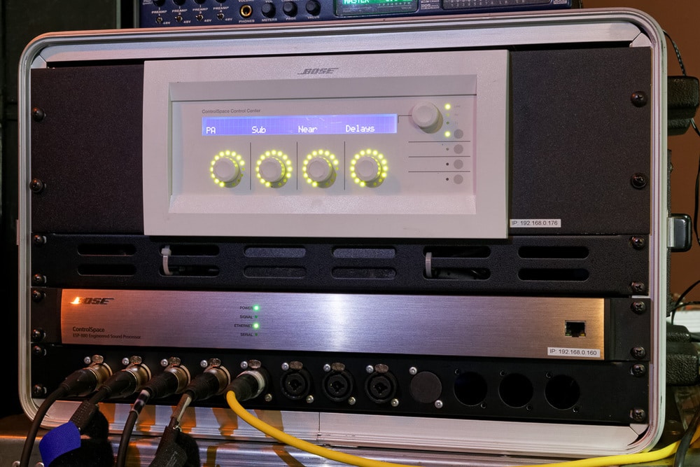 Aus dem Audiopult wurden fünf Ausgangssignale (links/rechts/Sub/Surround links/Surround rechts) geliefert, die analog in einen Bose ControlSpace ESP-880 Prozessor (1 HE) geführt wurden, der gemeinsam mit einem Bose ControlSpace CC-64 Steuer-Panel in einem 19″-Transportkoffer installiert war. Nach der Bearbeitung im Prozessor wurden die Signale digital über Glasfaser (per eingebauter Bose ESPLink-Schnittstelle) in die mit entsprechenden Karten ausgerüsteten Endstufen weitergeleitet.