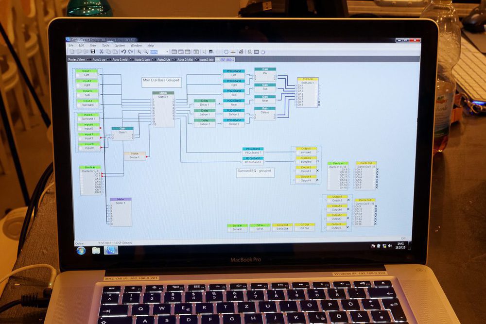 Die Endstufen stammten erwartungsgemäß von Bose und waren seitlich der Bühne in zwei Racks untergebracht. Produkte der Wahl waren variabel konfigurierbare 4 kW Power-Match-Endstufen des Typs PM 8500N mit einer Leistung von 8 × 500 Watt an 4 Ohm. Das „N“ im Namen weist auf die Netzwerkfähigkeit hin, und Frank Ruppert war am FOH-Platz mit einem Laptop anzutreffen, auf dem die Bose Software ControlSpace Designer installiert war.