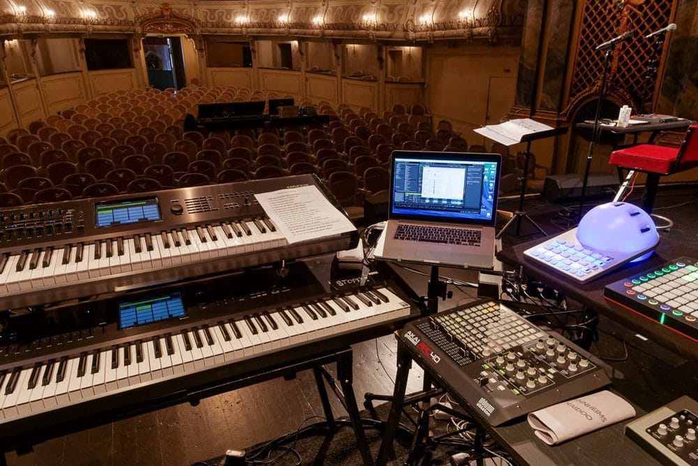 Beim Konzert fiel die Rolle des Instrumentalisten erwartungsgemäß Michael Herberger zu, der mit einem ganzen Park an Gerätschaften hantierte und sich zwischendurch auch immer wieder einmal an einen mit zwei Schoeps MK 4-Nierenkapseln an Standard-Verstärkern CMC 6 mikrofonierten Flügel setzte. Ansonsten wurde das Setup von zwei Korg Kronos Keyboards dominiert, um die sich weiteres elektronisches „Spielzeug“ in Form zahlreicher Controller (u. a. Akai APC40, Naonext Crystall Ball) gruppierte. Herbergers DAW stammte von Ableton – ein Timecode lieferte Taktungsinformationen für ein parallel am FOH-Platz aufgebautes Pro Tools, das durch Benedikt Maile versiert bedient wurde und bei allen Songs mit Ausnahme einer Pianoballade aktiv war.