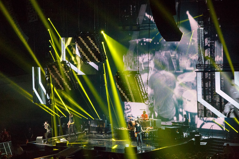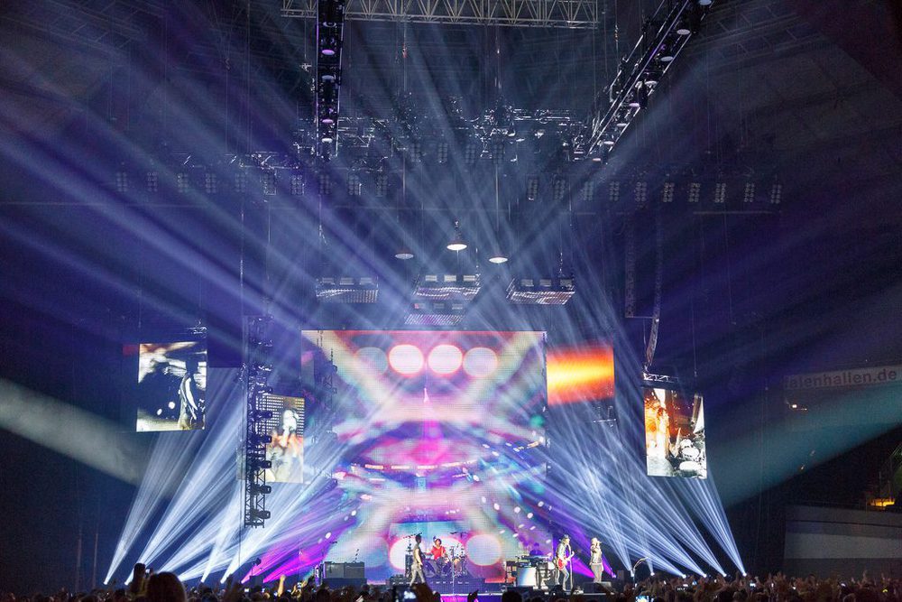 So wie bei dem Club-Showcase in Fulda – nur eben in Arena- Dimensionen – wurde die 100 m2 große Bühne später vom Publikum umspült und diente als zentrale Spielfläche für die Musiker. Der Laufsteg erhielt mehrere „Parkbuchten“, sodass sich die Akteure ohne Probleme darauf begegnen konnten bzw. sich nicht gegenseitig bei der Performance auf dem Steg behindern würden. Bei bestimmten Liedern wurden dort eigens Mikrofonständer positioniert und anschließend flink abgebaut. An der Spitze des Stegs war zudem genügend Platz vorhanden, um die Band für die „unplugged-Performance“ zu positionieren. Die präzise Anordnung bzw. Staffelung der Musiker auf Laufsteg und Bühne wurde dabei gezielt genutzt, um einzigartige Live-Kamerabilder zu inszenieren. Die LED-Wand im Hintergrund war in der Mitte geteilt und konnte zu beiden Seiten verfahren werden. Die Flügel dienten dabei nicht nur als Standort für Movinglights, sondern auch als Basis für die verfahrbare LED-Wand.