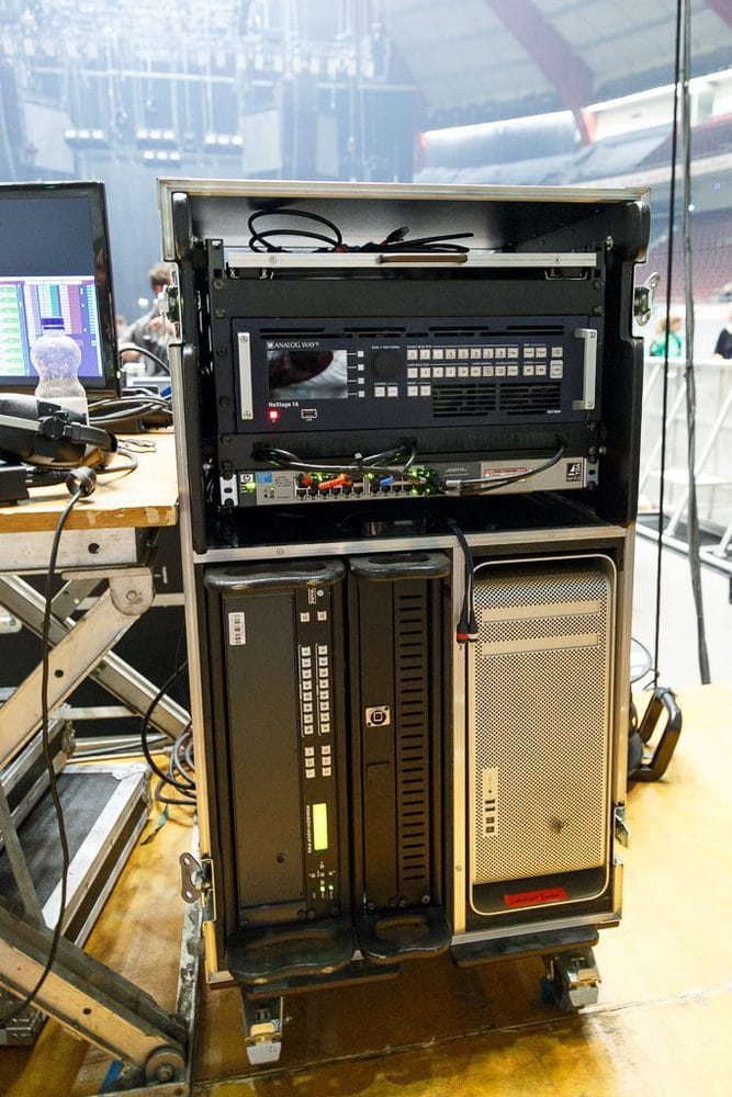 Damit der Catalyst nur zwei SDI-Eingänge berechnen musste, summierte ein Analog Way Nextage die sieben Signale (6 × Kamera, 1 × AppleTV) zu zwei Quadsplits. Außerdem war es so möglich, eine weitere Vorschau aller Signale für den Operator zu generieren und die Eingangssignale direkt in Schwarzweißbilder umzuwandeln. Der Server musste dazu nicht zusätzlich belastet werden. „Der Analog Way Next age 16 schafft dies alles nahezu latenzfrei und ersetzt an der Position mindestens vier einzelne Geräte. Zudem ist die Bedienung über das eingebaute WEB-Interface extrem einfach und intuitiv“, lobte Thomas Quernhorst: „Und darüber hinaus gibt es eine offene Schnittstelle, die es erlaubt, den Analog Way – in unserem Fall vom Catalyst aus – via TTP-Commands fernzusteuern, was sich hier und da als extrem sinnvoll und praktisch erwies.“ Der Nextage fungierte auf dieser Tournee als souveränes Bildmanagement, dessen Vorteile die einfache Handhabung, die Vielfältigkeit und die nahezu latenzfreie Verarbeitung der Eingangssignale waren (die Latenz der gesamten Signalkette lag bei max. vier Frames).