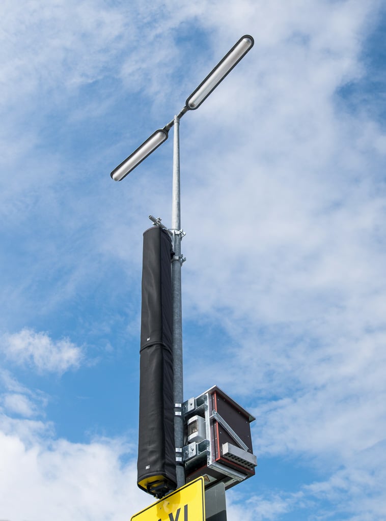 Thomas zur Lage: Letztlich blieb für die Lautsprechermontage nur die Befestigung an den Laternen der Straßenbeleuchtung. Die waren mit ca. 35 m Abstand zueinander einigermaßen geeignet platziert und bezüglich der Lasten noch begrenzt aufnahmefähig. Damit schieden auch kompakte Line-Arrays aus, insbesondere wegen der Momentenlasten, die durch die meist weit auskragende Halterung entsteht. Konventionelle Lautsprecher, also Punktquellen, kamen wegen der zu geringen Wurfweite, des größeren Pegelabfalls über die Distanz und der größeren Störschallproblematik ebenfalls nicht in Frage.
