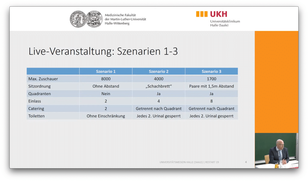 Konkrete Empfehlungen bei einer Inzidenz von >50/100.000/7 Tage: Veranstaltungen sind bei guter Lüftung immer noch möglich, aber Reduktion um rund 75% – also Bestuhlungsplan nach Szenario 3 (strikter Abstand 1,5m), Einlassschleusen max. 250 Personen/Schleuse sowie eine Deckelung der max. Zuschauerzahl/Woche/Veranstaltungsort auf 25% der regulären Besucherzahlen.