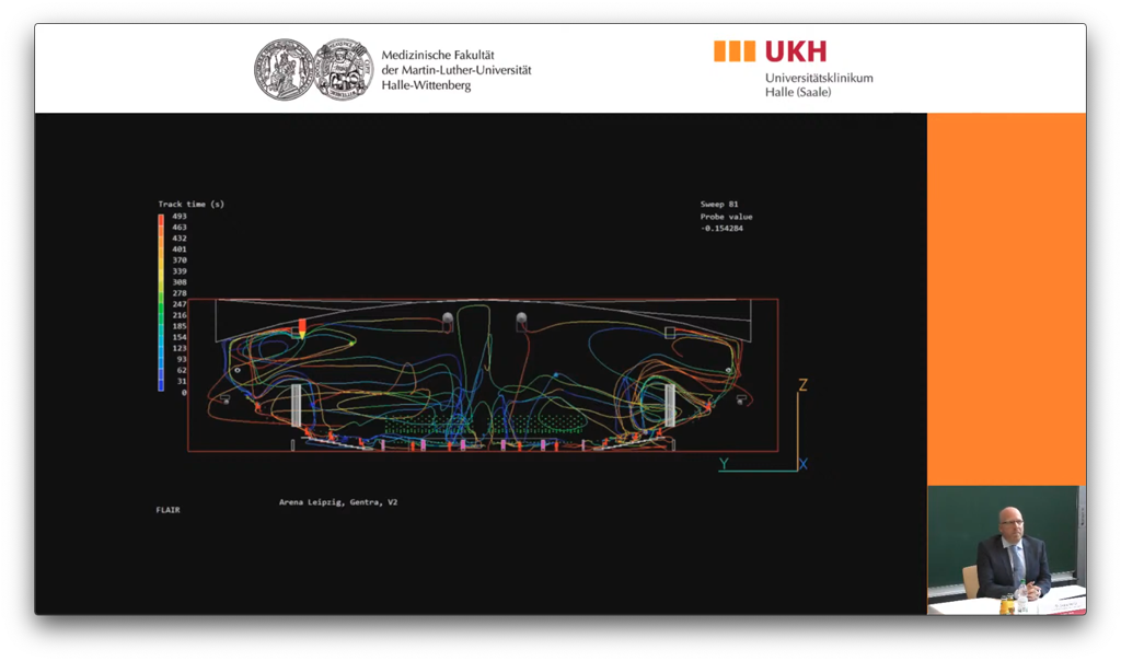 Mittels einer rein virtuellen Computersimulation („Computations Fluids Dynamics“) wurden in einem zweiten Schritt die Effekte der Lüftung auf die Verbreitung der Aerosole im Raum erfasst. Dabei wurde die Arena Leipzig im Rechner nachmodelliert, mit 4.000 gesunden sowie 24 infektiösen Probanden besetzt und deren Ausstoß und Inhalation von Aerosolen „gemessen“.