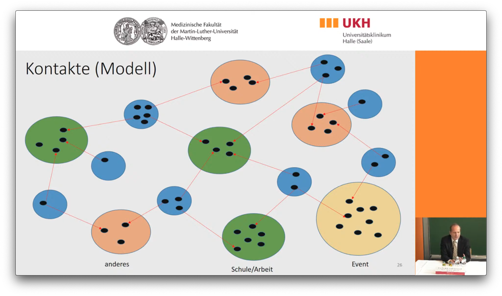 Zu diesem Zweck wurden die obigen Erkenntnisse in ein Modell der gesellschaftlichen Kontaktstrukturen (Polymod-Studie aus 2007/2008) integriert. Neben den dort erfassten Kontaktsettings wie „zu Hause“, „Arbeit/Schule“ und „anderen“ (ÖPNV, Einkaufen, Sport usw.) wurde hier das Setting „Event“ mit aufgenommen und so die Auswirkungen der zusätzlichen Kontakte auf die Gesellschaft betrachtet.
