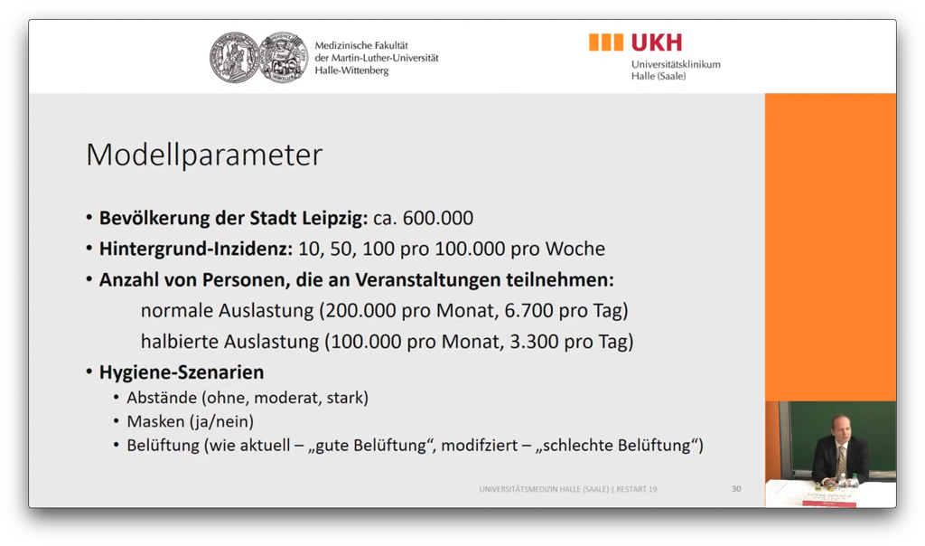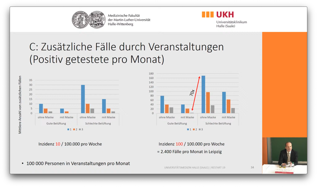 Geht man nun von einer niedrigen Inzidenz von 10 sowie von 200.000 Besuchern pro Monat aus, die statistisch in Leipzig pro Monat eine Veranstaltung besuchen, so kommt man laut Studie auf lediglich rund 15 Infizierte, die sich innerhalb eines ganzen Monats auf Veranstaltungen aufhalten. Dies kann sich natürlich bei einer Inzidenz von 100 auf bis zu 75 infektiöse Besucher steigern – wohlgemerkt aber stets im Mittel, über den Zeitraum eines ganzen Monats und auf alle Veranstaltungen innerhalb dieses Zeitraums in der Region verteilt.