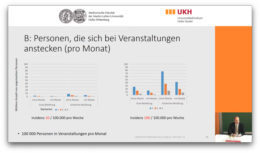 Bei einer niedrigen Inzidenz von 10 und einer um 50% reduzierten Gesamtanzahl an monatlichen Veranstaltungs-Besuchern auf 100.000 steigt die Zahl der Infizierten von (rechnerisch) unter 1 auf maximal 8 pro Monat – selbst im schlimmsten Szenario ohne Abstand, ohne Maske und bei schlechter Belüftung.