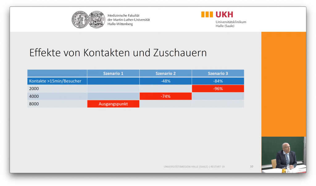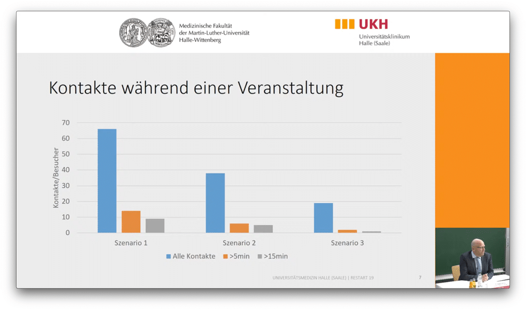 Reduzierte Kontakthäufigkeit Kombiniert man die reduzierten Kontakte durch die jeweiligen Abstands-Szenarien mit der durch die strengeren Konzepte ebenfalls sinkenden Besucherzahl des Events, ergibt sich eine in Szenario 2 um 74%, in Szenario 3 sogar eine um 96% reduzierte Kontakthäufigkeit im Vergleich zur „sorglosen“ Variante 1 (Bild: Universitätsmedizin Halle (Saale))