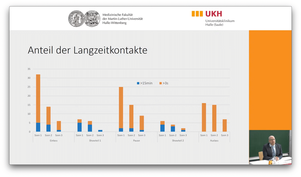 Anteil der Langzeitkontakte im Verlauf der unterschiedlichen Veranstaltungsphasen. Der Logik einer Veranstaltung entsprechend entstanden die meisten Langzeitkontakte dabei nicht während Einlass, Pause oder Auslass, sondern in den Showteilen, in denen das Publikum mittels Bestuhlung „fixiert“ war (Bild: Universitätsmedizin Halle (Saale))