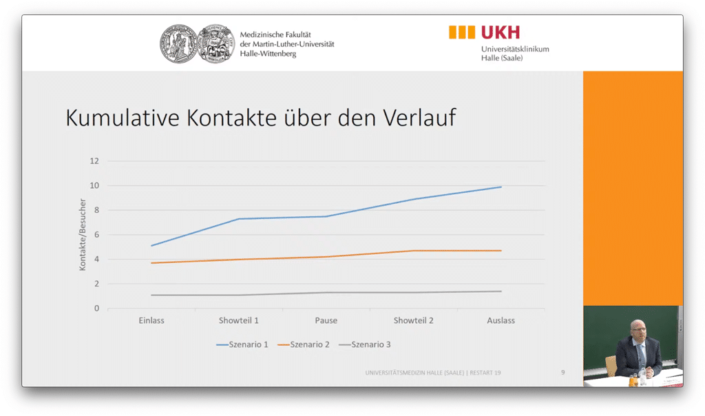 Im Live-Experiment wurden die für eine Verbreitung des Virus aktuell als relevant angesehenen Kontakte ermittelt, die in den drei Szenarien mit unterschiedlichen Abstands- und Kontaktregelungen entstanden. Simuliert wurden hier eine prä-pandemische Situation, in der alle Besucher die gleichen wenigen Ein- und Ausgänge nutzten, ohne Abstand saßen und auch während der Pause keinerlei Distanz wahrten.