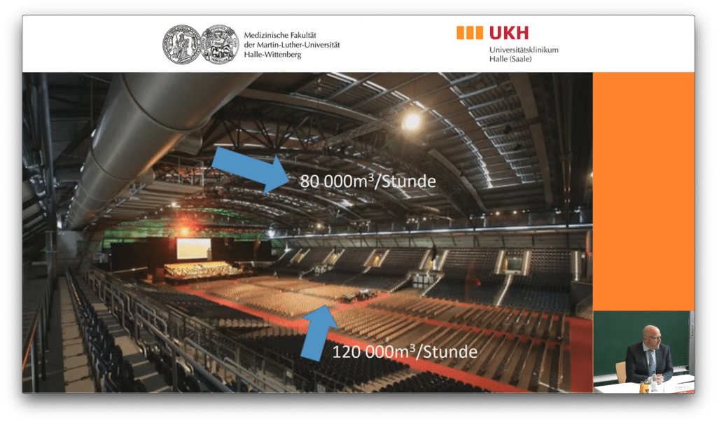 In einer ersten Simulation der realen Lüftungsanlage mit Auslässen unter den Tribünen sowie Wurfdüsen an der Decke der Hallenseiten stellte sich dabei heraus, dass die Luft (inkl. Aerosole) in großen Schleifen in Richtung Hallendecke und anschließend wieder abwärts über die Tribünen strömte – eine auf den ersten Blick eher ungünstige Situation.