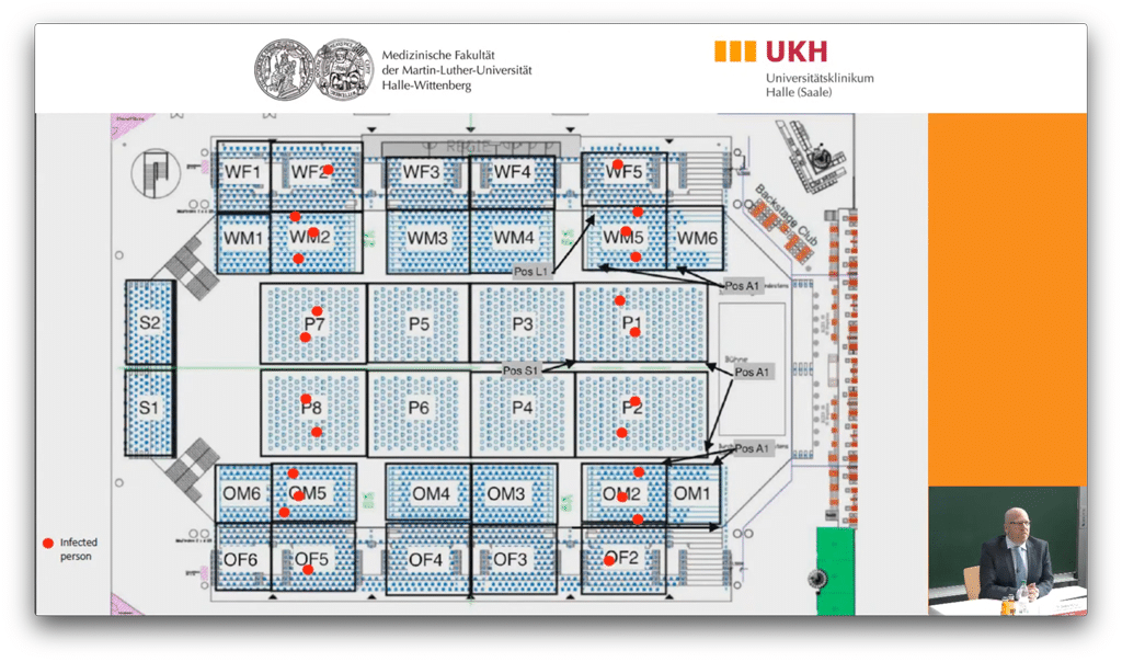 Virtuell wurde in Schritt zwei mittels Computersimulation die Aerosolbelastung in der Arena unter Berücksichtigung der Lüftungssituation und -anlage errechnet und bewertet. Zuletzt wurden die Ergebnisse aus 1 und 2 in ein epidemiologisches Modell überführt, um eine Aussage über die Auswirkungen einer Veranstaltung auf die Krankheitslast in der Bevölkerung treffen und die Ergebnisse somit im sozialen Kontext bewerten zu können.