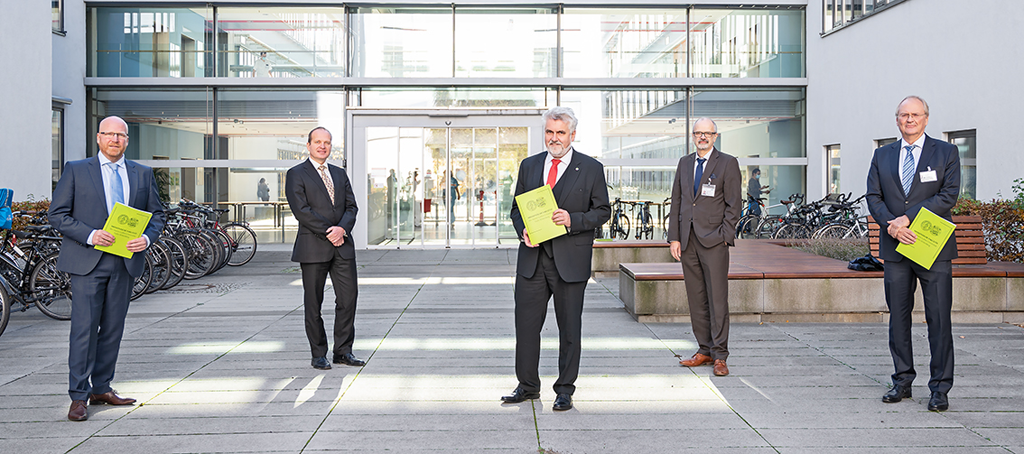 Gesichter hinter der Studie (v.l.n.r.): Dr. Stefan Moritz (Projektleiter, Leiter Sachgebiet Infektiologie, Universitätsmedizin Halle/Saale), Prof. Rafael Mikolajczyk (Direktor Institut für Medizinische Epidemiologie, Biometrie und Informatik, Universitätsmedizin Halle/Saale), Prof. Armin Willingmann (Minister für Wirtschaft, Wissenschaft und Digitalisierung des Landes Sachsen-Anhalt), Prof. Michael Gekle (Dekan Universitätsmedizin Halle/Saale) und Prof. Thomas Moesta (Ärztlicher Direktor Universitätsmedizin Halle/Saale) (Bild: Universitätsmedizin Halle (Saale))