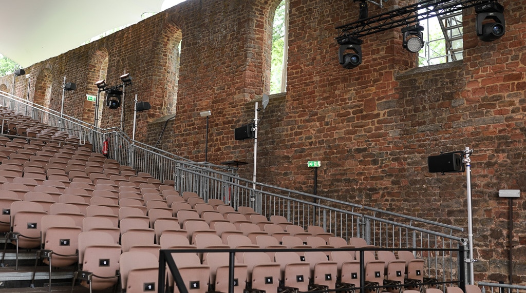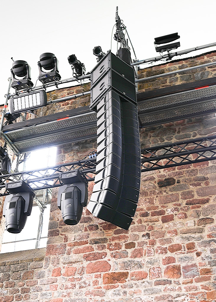 In der Ruine ist die Beschallung als 3D-Setup mit L-Acoustics-Modulen aufgebaut, sodass Klänge neben der Links-Rechts-Hang-Beschallung an der Front zusätzlich an den Tribünenrängen entlang oder gar auf der Bühne selbst positioniert werden können. Insgesamt sind rund 50 Lautsprecher installiert, samt den erwähnten zwei „Bananen“ (zwölf KIVA II, zwei X8), jeweils 5 Surround-Lautsprecher an den Seiten (5XT Nearfields) verbaut. Zusätzlich zu Subs sind LFE-Bässe (SB28) vorne und unter der Tribüne verbaut. „Der Sub ist der musikalische Bass bei uns, der musikalische Töne transportiert, der LFE-Kanal vermittelt ‚Erdbeben-Tiefbassanteile‘. Das kommt beim Musical seltener vor, aber bei Theaterstücken zum Beispiel, wenn ein Gewitter oder eine Explosion abgebildet wird. Dann ‚ruckelt‘ es auf der Tribüne auch.“
