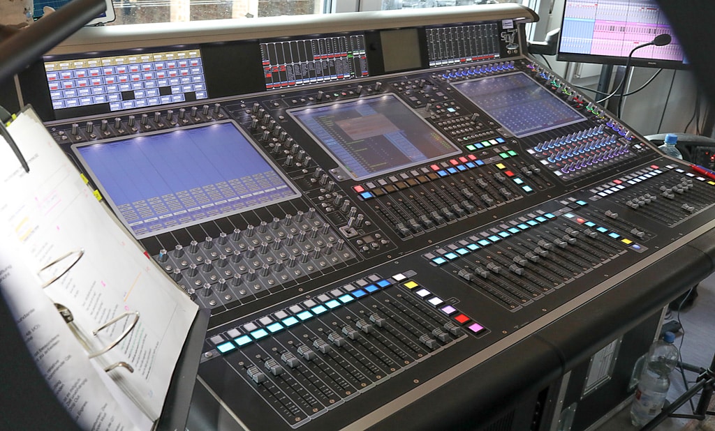 Der FOH-Platz befindet sich in einem Container, aufgebaut auf einem Gerüst am Ende der Tribüne; der Zugang erfolgt über die Rückseite durch eine Leiter am Gerüst mit Handlauf, die Leiter wackelt leicht und muss „bewusst“ bestiegen werden. Grünsfelder nutzt eine DiGiCo Quantum SD7T-Konsole, die mit den Signalen versorgt wird. Tagsüber ist für die Proben ein zusätzliches FOH-Pult im Tribünenbereich aufgebaut, eine DiGiCo EX-007-Konsole. „Das Pult wird immer auf- und abgebaut. Du hast abends eine Produktion, und tagsüber wird geprobt. Da du im FOH oben nicht optimal hörst, musst du immer wieder in den Saal zurück.“ Er spricht die Gegebenheiten der FOH-Position – einerseits befindet er sich außerhalb des Surround-Felds, er ist im Container abgeschottet und hört daher über Monitore ab. Andererseits ist er nicht direkt im „Bühnengeschehen“ drin, was für die Proben sinnvoll ist. „Die EX-007 ist eine Full-Remote-Konsole – dort ist praktisch die komplette SD7 vorhanden. Mein Kollege steht dann oben an der SD07, ich bin unten an der EX-007, wir können komplett parallel arbeiten.“