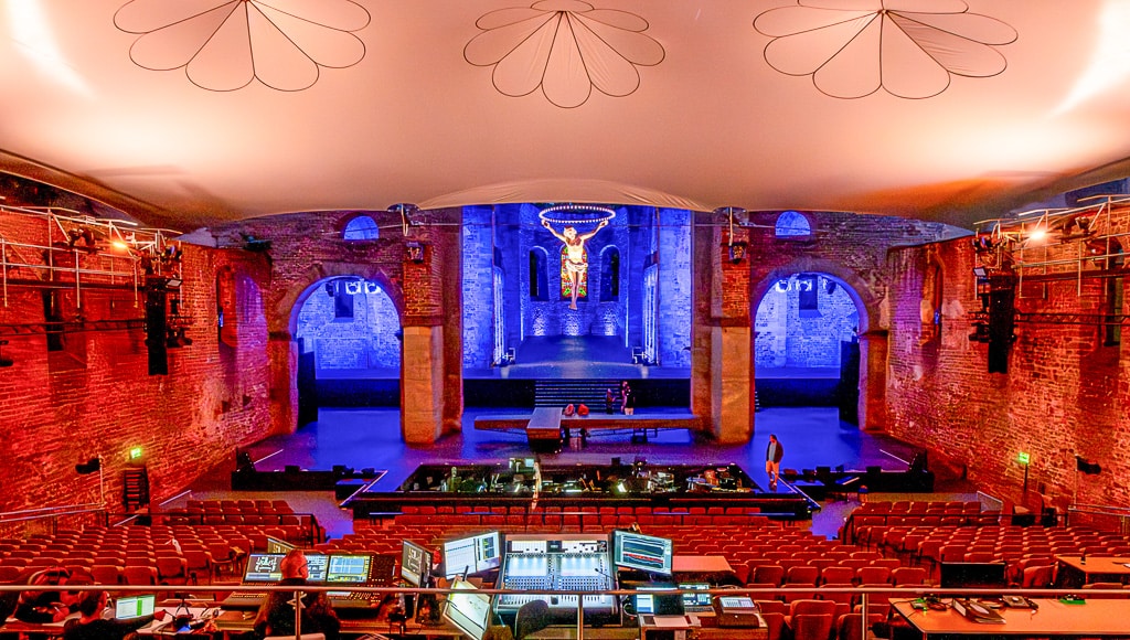 Der Komponist sitzt bei den Proben regelmäßig auf der Tribüne, so Grünsfelder. „Dazu existiert ein Dante-Anschluss für ihn, auf den er mit seinem Notebook drauf kann. Er installiert sich die virtuellen Dante-Soundkarten und spielt komplett in die Ruine rein – unabhängig von meiner Produktionsarbeit. Er kann selbst Signale in den Saal geben, auf die Surrounds, hinten in die Krypta rein oder aus dem Seitenschiff heraus – um zu hören, wie das klingt. Dazu haben wir noch Akku-Boxen positioniert. Wir können beispielsweise eine Box in das komplett fahrbare Kreuz legen, sodass einzelne Elemente direkt aus dem Kreuz kommen – egal, wo es sich befindet. Das kann der Komponist autark ausprobieren. Die jeweiligen Komponisten sind begeistert, weil sie parallel zu uns arbeiten können, ohne auf uns angewiesen zu sein. Unser Qlab-Zuspieler ist offen programmiert: Das Levelling kommt aus Qlab heraus. Während wir am Orchester arbeiten, können per Qlab trotzdem parallel die Sounds gefahren werden – unabhängig davon, in welchem Cue wir sind.“ Das gleichzeitige Arbeiten erfordert Disziplin und einen angepassten Workflow. „Die Arbeitsprozesse müssen definiert sein. Wir sind mit einer festen Crew hier. Der Qlab-Mann hat Kontakt mit dem Komponisten, sie tauschen sich aus, die Files laufen direkt über einen Server. Beim Abspielen über Qlab kann der Komponist gleich Rückmeldung geben, ob es passt.“ Das verkürze Wege und Arbeitszeiten.