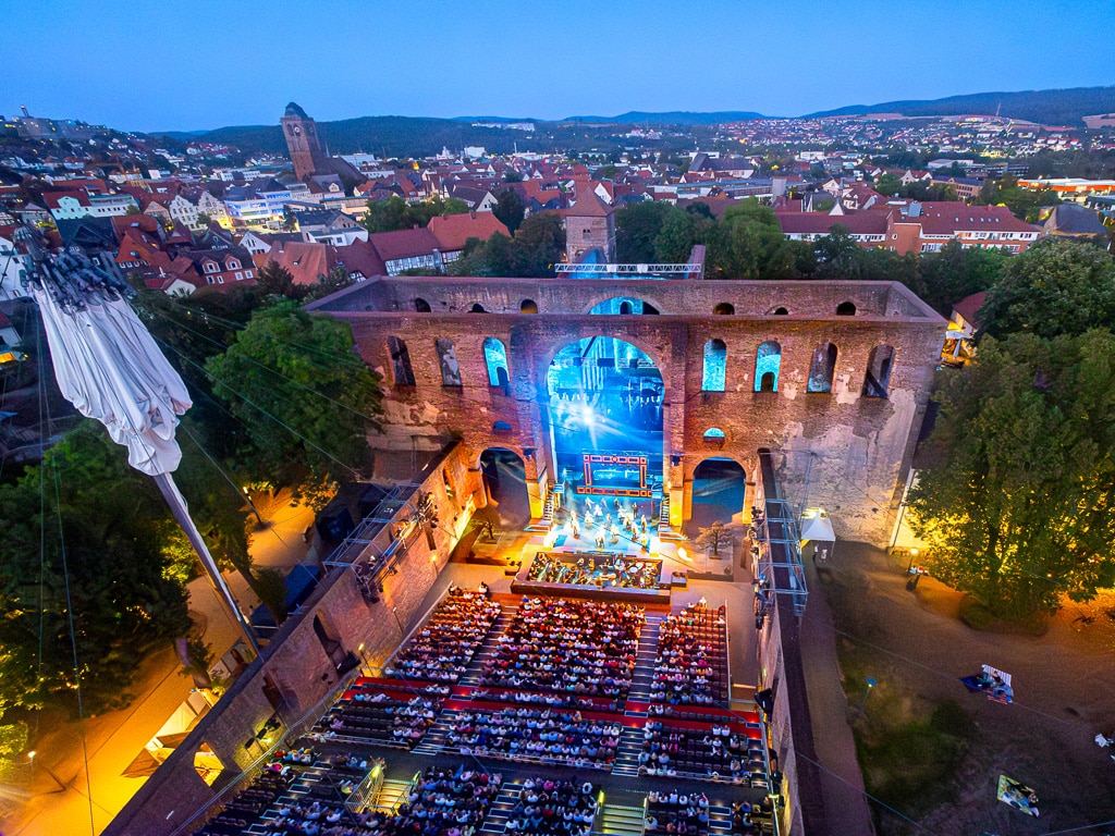 „Das ist kein klassisches Theater oder Opernhaus – alles, was hier drin ist, muss installiert werden“, erklärt FOH-Mann Jörg Grünsfelder. Der Innenbereich der Stiftsruine Bad Hersfeld ist normalerweise leer – Bühne, Zuschauertribüne und Technik werden jedes Jahr für die Festival-Saison, die von Juli bis September dauert, errichtet.
