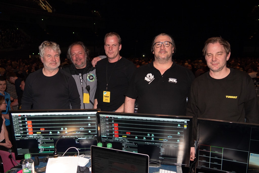 Andre Bress steuerte die Videozuspielungen am FoH-Platz. Dazu gehörten die vorgemischten Livebilder aus der Videoregie sowie der animierte Content, den ein siebenköpfiges, europäisches (England/Frankreich/Deutschland) DesignerTeam in enger Zusammenarbeit mit Herbert Grönemeyer für die entsprechenden Lieder entwickelt hatte. Die Videodaten wurde über die Software Resolume und einen Mac Pro 6.1 6- core mit Dual D700 eingespeist.