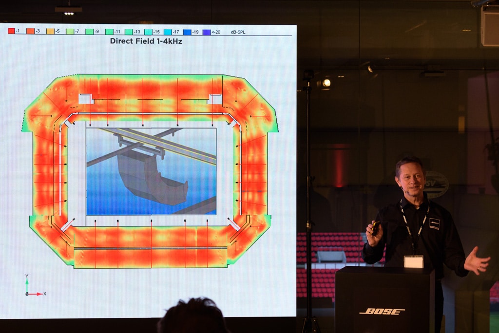 Zeitlich zusammen fiel mit dem Wunsch, das Stadion audioseitig auf den Stand der Technik zu bringen, die Markteinführung der neuen Arena-Match-Serie von Bose, sodass – besonders erfreulich natürlich für das zunehmend ausgebaute Europa-Team der Profiabteilung von Bose – der Serienstart gleich mit einer fertigen Installation in einem europäischen Stadion begangen werden konnte. Boses Philosophie ist bei diesen Serien, dass man den geforderten Ansprüchen an die Coverage mit einer Vielzahl an Modellen und Optionen entgegenkommt. Gerade, wenn ein Line-Array nicht optimal über den Besuchern positioniert werden kann, hilft natürlich, wenn man vom gegebenen Punkt aus die Coverage im Line-Array so anpassen kann, dass die Zonen in den Hörflächen bestmöglich abzudecken sind. Und das betrifft beim Arena-Match beide Dimensionen – vertikal und horizontal.
