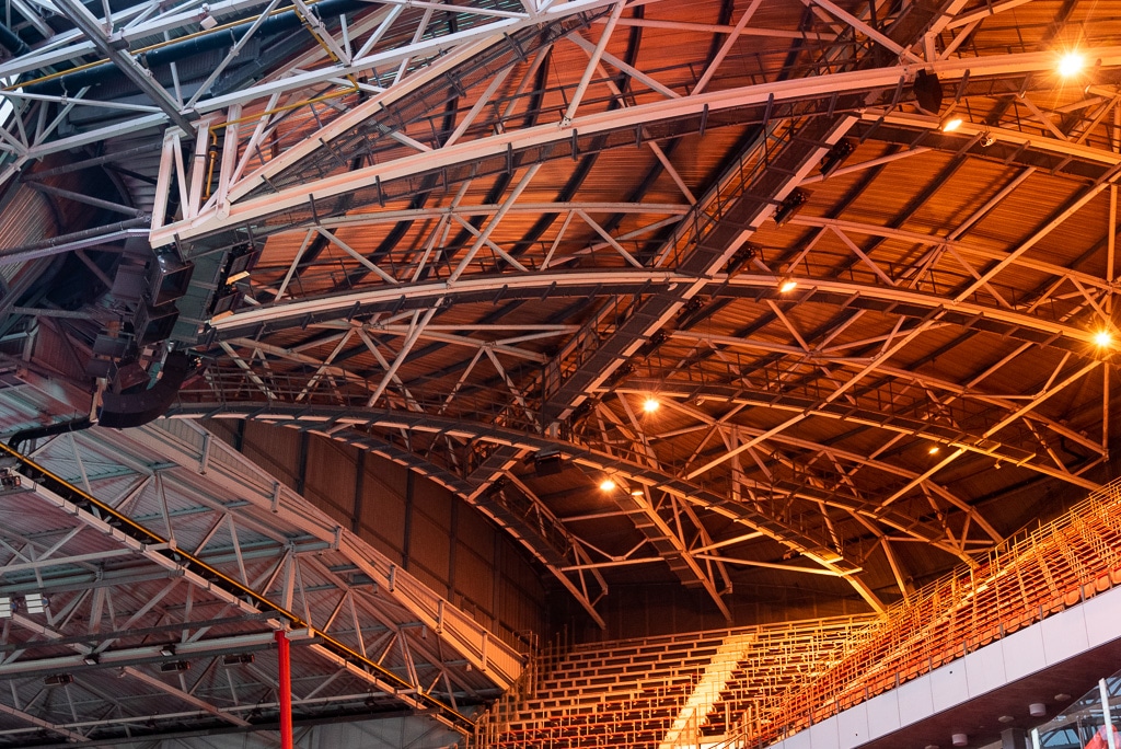 Da Philips sein Stammwerk hier seit fast 130 Jahren beheimatet hat, kann man sich denken, wie das Stadion in Eindhoven heißt: Fast ebenso geschichtsträchtig wurde in der Nutzung zwischen Leichtathletik und Fußball hin und her gewechselt, die Tribünen immer wieder verändert und erweitert und schließlich auch noch die Stadionecken zugänglich gemacht, um auf das heutige Fassungsvermögen von fast 38.000 Plätzen zu kommen. Seit 2019 präsentiert sich das Stadion mit einer komplett neuen Beschallung, die ausgesprochen in die Jahre gekommen war. Herausforderung war dabei aber nicht allein die pure Größe der Tribünen: Das Einbringen von Lasten in das Dach gestaltete sich ausgesprochen kritisch. Zwei Umstände waren dabei hinderlich: Einmal wurden zusätzliche Gewichte von statischer Seite nicht gerne gesehen. So wurde dann auch sorgsam jedes demontierte und abgelassene Material am Boden erfasst und gewogen. Danach durfte dann das nächste Neumaterial seinen Weg nach oben antreten. Ein Grund dafür liegt in der aufwändigen Heizungsanlage, deren schwere Strahler (optisch leicht mit Lautsprechern zu ver- wechseln, aber bei unserem frostig-kalten Ortstermin leider außer Betrieb …) dicht an dicht im Dach montiert sind. Außerdem wurden auch einige Wunschpositionen, auf die man aus akustischer Sicht gerne einen neuen Lautsprecher optimal platziert hätte, von Seiten der Statiker nicht zugelassen. Umso wichtiger also, dass man die verbleibenden Möglichkeiten optimal nutzte.